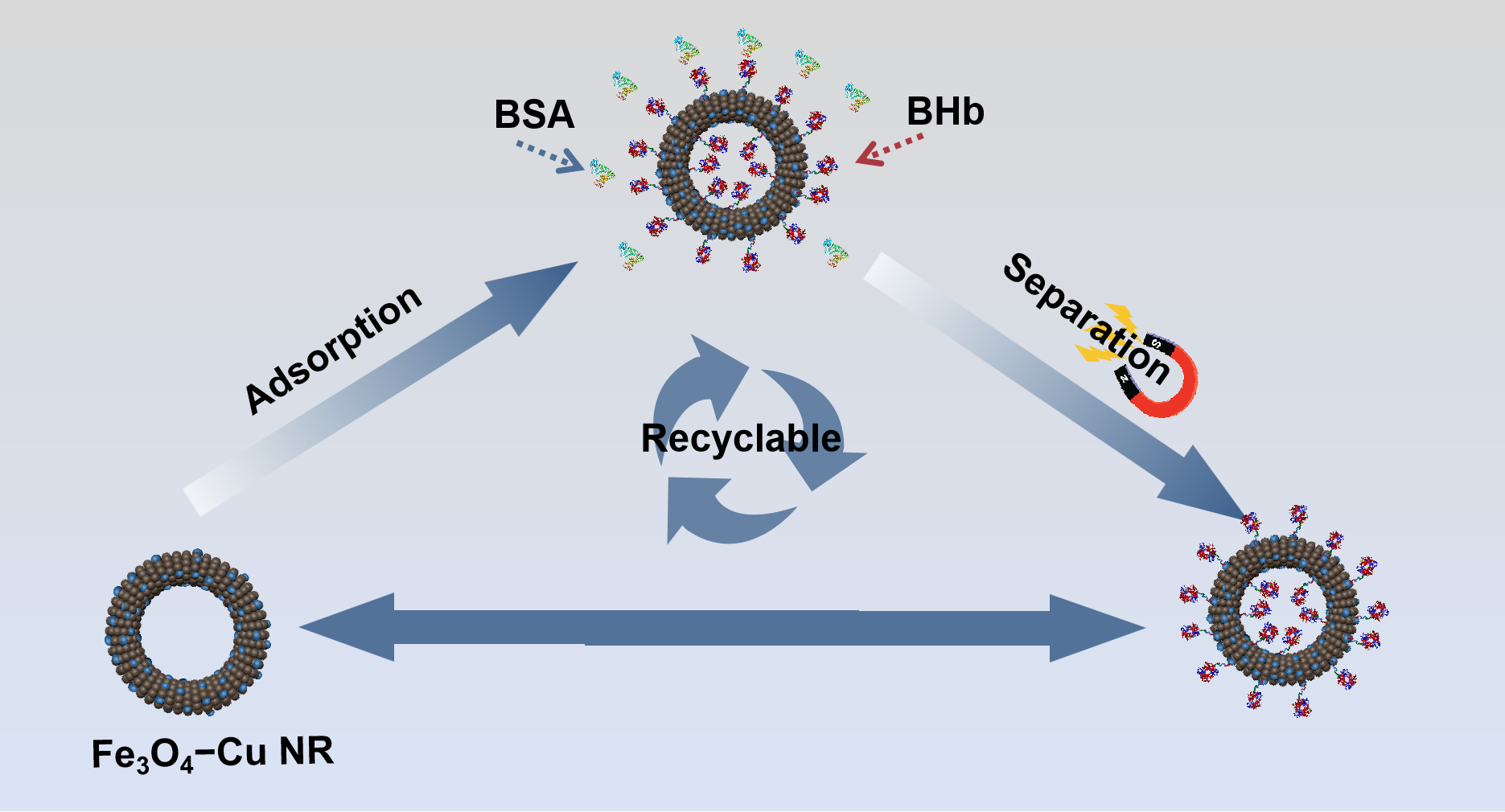 该工作基于无配体策略制备了一种铜掺杂的磁性纳米环(Fe3O4−Cu NR),作为新型吸附剂用于选择性分离富组氨酸蛋白质。具有独特环状结构特征的 Fe3O4−Cu NR 不仅为富组氨酸蛋白质提供大量的吸附位点,同时保持了良好的磁性分离性能(61.7 emu g-1)。因此,Fe3O4−Cu NR 对牛血红蛋白 (BHb) 具有显著的吸附容量(932.2 mg g-1)和高选择性(SF<0.1)。此外,Fe3O4−Cu NR还具有良好的重复利用性,且能成功从牛血样中选择性分离和去除BHb,具有实际应用潜力。