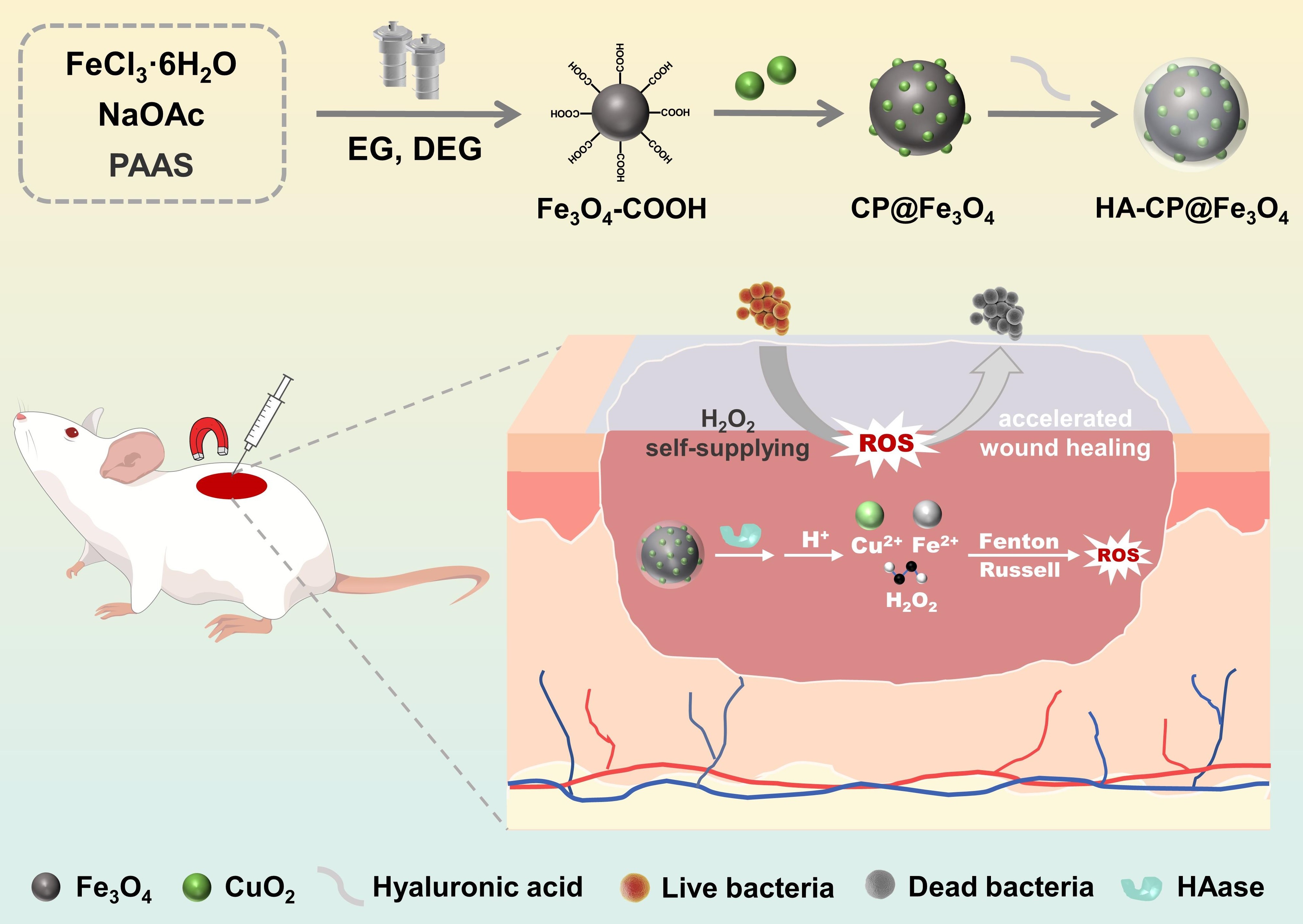 在这项研究中,通过将透明质酸(HA)涂覆在载CuO2的四氧化铁纳米颗粒上,开发了一种具有酶响应特性的先进纳米抗菌系统HA-CP@Fe3O4。透明质酸的涂层不仅稳定了CuO2纳米材料,而且提供了对透明质酸酶的响应性,这种酶通常由一些细菌分泌。在透明质酸酶分泌菌存在的情况下,HA-CP@Fe3O4的透明质酸外层发生分解,从而释放CuO2@Fe3O4。释放的CuO2@Fe3O4通过Fenton-Russell效应在被感染的微环境中自供H2O2并产生活性氧(reactive oxygen species, ROS),最终达到有效而精准的抗菌活性。同时,Fe3O4提供的磁性能使该物质能够被定向到感染部位。体外和体内实验均表明,HA-CP@Fe3O4在低浓度(30μg/mL)下具有出色的抗菌能力,卓越的生物相容性和加速伤口愈合的能力。这项工作的发现为靶向和精确CDT提供了一种新的和有前途的方法。