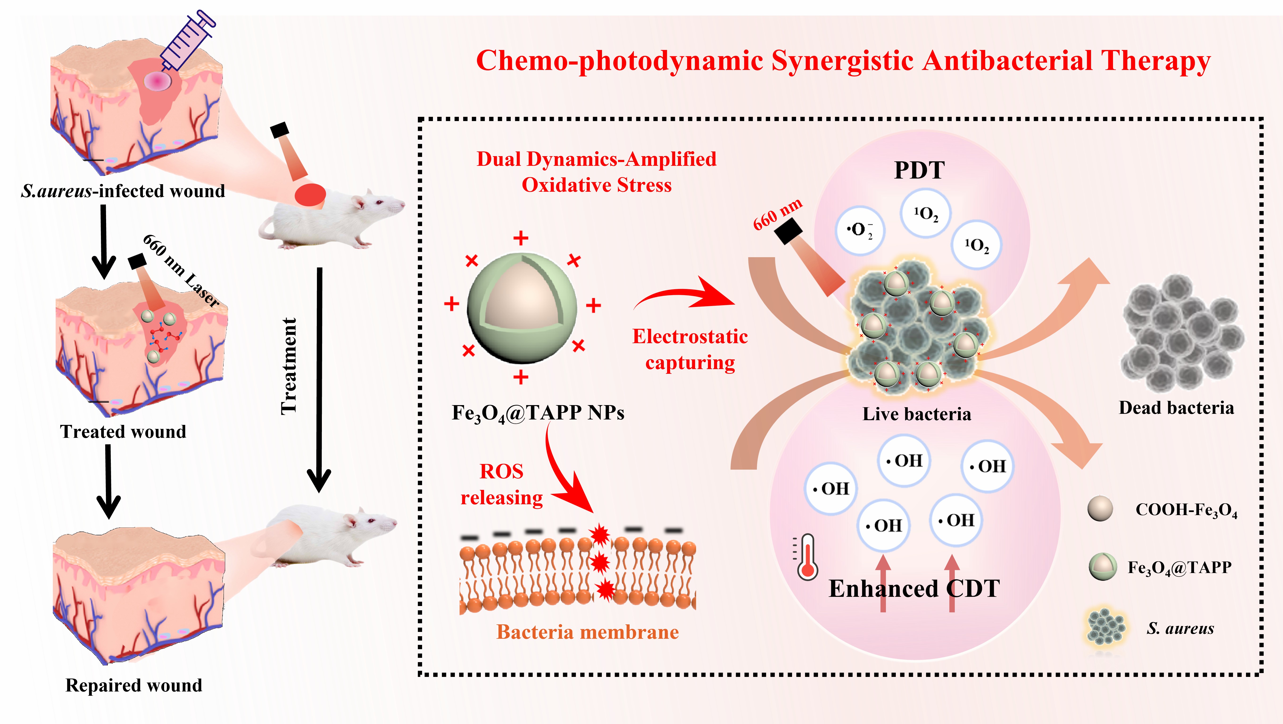 本研究开发了胺卟啉(TAPP)功能化的Fe3O4纳米颗粒(纳Fe3O4@TAPP NPs),作为多功能抗菌平台。TAPP层不仅可以在酸性环境中通过静电吸引捕获细菌,而且可以在近红外(660nm)激发时增加局部热量,从而缩短有效作用距离并提高·OH的产生率。值得注意的是,TAPP通过其胺基和Fe3O4上的羧基共价结合到Fe3O4纳米颗粒上,从而防止TAPP在生理条件下自聚集,并保持PDT效应。因此,Fe3O4米颗粒上的TAPP层具有三个功能,同时解决了三个局限性,以三重作用策略增强CDT。开发的Fe3O4@TAPP NPs在体外和体内都表现出提高的抗菌效率。总的来说,这项研究提供了一种创新的策略,用于构建协同增强CDT抗菌治疗的抗菌纳米平台,在未来的生物医学应用中具有巨大的潜力。