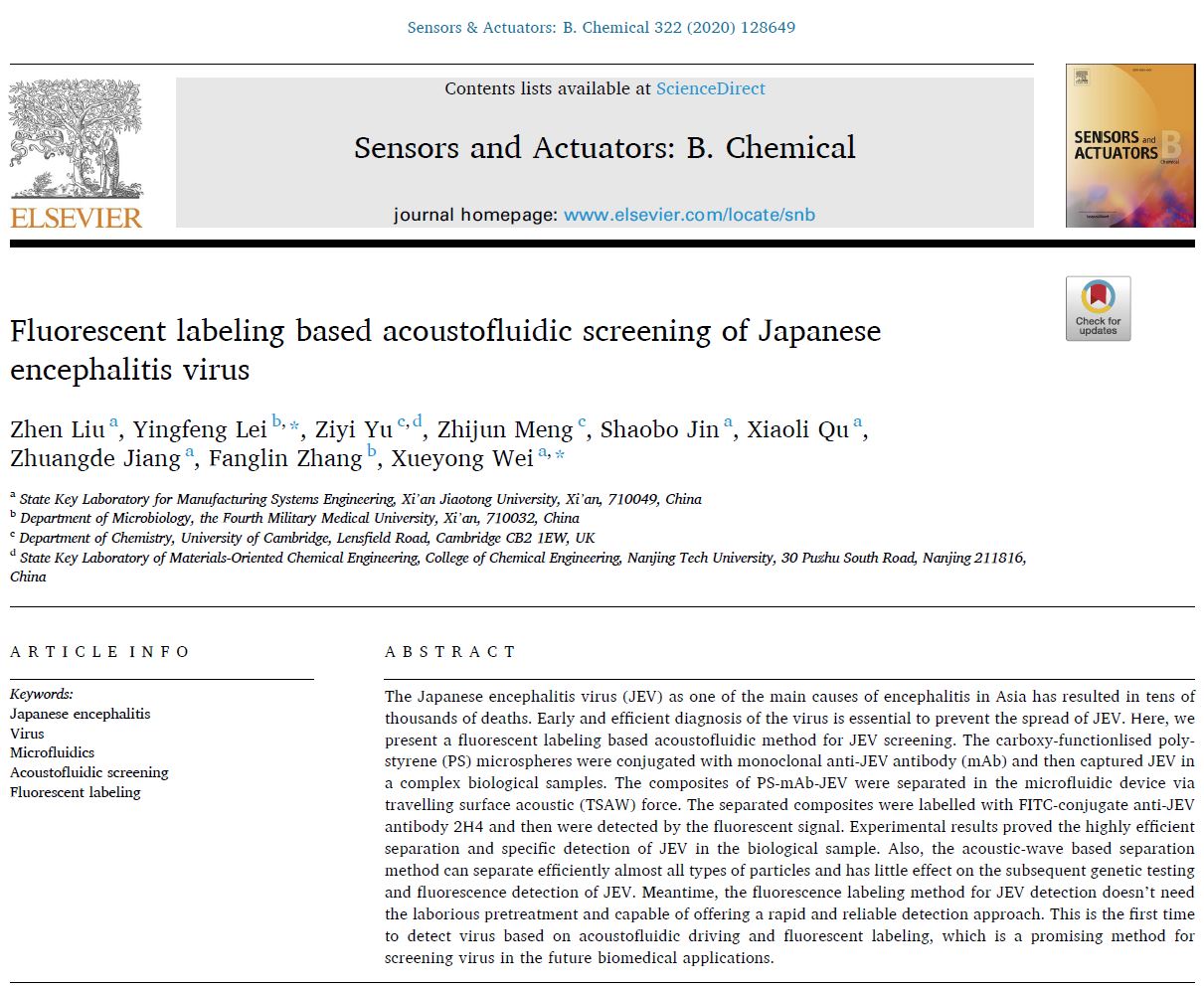 Congratulations to LIU Zhen and our collaborators! Acoustofluidic screening JEV work is online!
