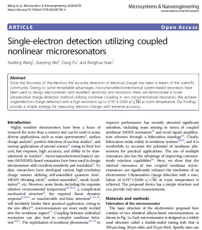 Scientists from China have developed a novel method for significantly enhancing the resolution of electrometers, paving the way for new devices for various applications, including mass spectrometry, surface charge analysis, and aerosol science. Owing to their low cost, high accuracy, and ability to be batch manufactured, microelectromechanical systems (MEMS)-based resonators have been used to design electrometers with excellent sensitivity and resolution. However, their complicated mechanical structure, low environmental temperature, and inability to detect in real-time have limited their applications. A team of Chinese researchers led by Ronghua Huan from Zhejiang University and Xueyong Wei from Xi’an Jiaotong University demonstrated an electrometer that uses two coupled nonlinear MEMS resonators, significantly enhancing its charge detection resolution and sensitivity. The electrometer is capable of measuring single-electron charges extremely accurately at room temperature and with ultrahigh resolution in real-time.