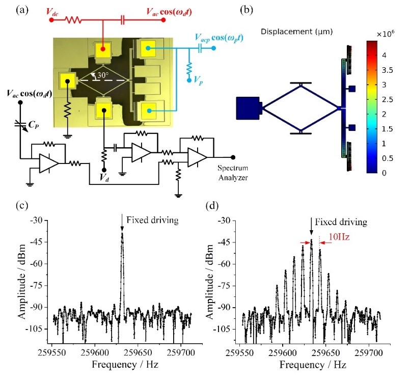 光频梳是由一系列离散的、等间隔的频率成分组成的宽带光谱,并且各频率分量具有稳定的相位关系。作为迄今为止最有效的绝对光学频率测量工具,它就像一把“光尺”,使人类能够对光学频率实现非常精密的测量。光频梳主要聚焦于电磁波频段,当面向声波频段时,声频梳应运而生。声频梳作为光频梳的一种扩展和类比,在声学测距、成像和传感等方面具有广泛潜在的应用,受到越来越多研究者的关注。MEMS谐振器因在声子存储上的优势已经成为产生和探索声频梳的理想研究对象。近年来,基于内共振、参数泵浦、模态耦合等手段,在MEMS谐振器中发现了声频梳现象,但有趣的是,频梳中普遍存在梳齿幅值的不对称性现象。虽然声频梳的产生机理已有很好的理论解释,但是声频梳中的不对称性现象仍然没有答案。