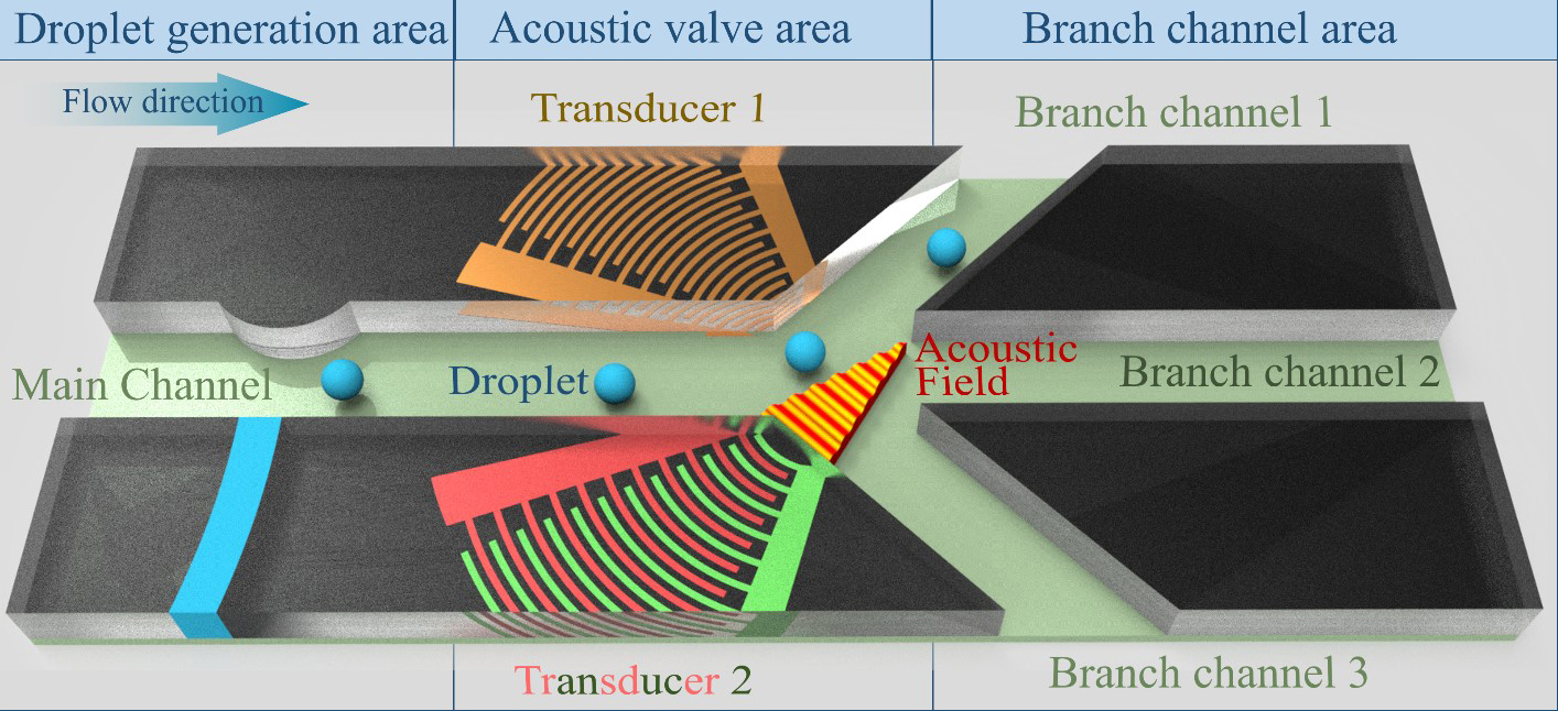 近日,西安交通大学机械工程学院蒋庄德院士团队韦学勇教授与其博士研究生秦咸明在英国皇家化学会期刊 Lab on a chip 上发表题为“Acoustic valve in microfluidic channels for droplets manipulation”的研究论文,提出了一种在声学微纳操纵领域和微流控领域的新概念——声学阀。基于MEMS技术和微流控平台,声学阀的最大特点是其功能多、适用性强。通过两组聚焦声学场的协作,声学阀可实现捕获、主动分选、被动分选的功能,并且适用于粒子、液滴和细胞等多种目标。与介电泳力分选器件通过启闭实现主动分选不同,无论是驻波还是行波声学器件,大多依靠基于波长尺寸和目标声学特性的选择性来实现被动分选。声学阀器件结合了二者的优势,通过两组声换能器的巧妙布置来实现对多个分支流道的启闭控制,并进一步实现了对不同目标的操纵。这种将主被动分选和捕获功能集成在一块芯片上的声学阀器件,具有高度的适用性和可拓展性,不仅为微纳样品的分选提供了新的全面化解决方案,更大大提高了声学器件在生物医学领域内的性能潜力和应用前景。