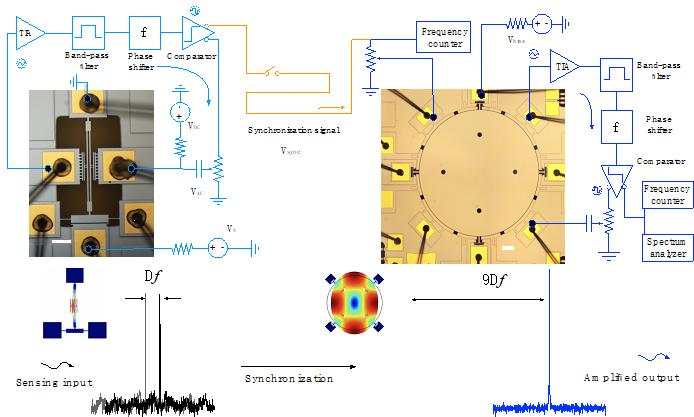 基于此,西安交通大学韦学勇教授课题组和浙江大学宦荣华教授首次利用将超谐同步技术应用于静电计,完成了9倍灵敏度放大。同时,由于使用硅基盘式振荡器作为最终的频率输出元件,高频率稳定性、低噪声的特性保证了放大信号的质量。实验结果显示,微机械振荡器间的超谐同步效应可以将原本双端固支音叉静电计的性能在灵敏度方面的9倍放大和3倍的频率稳定性提升。