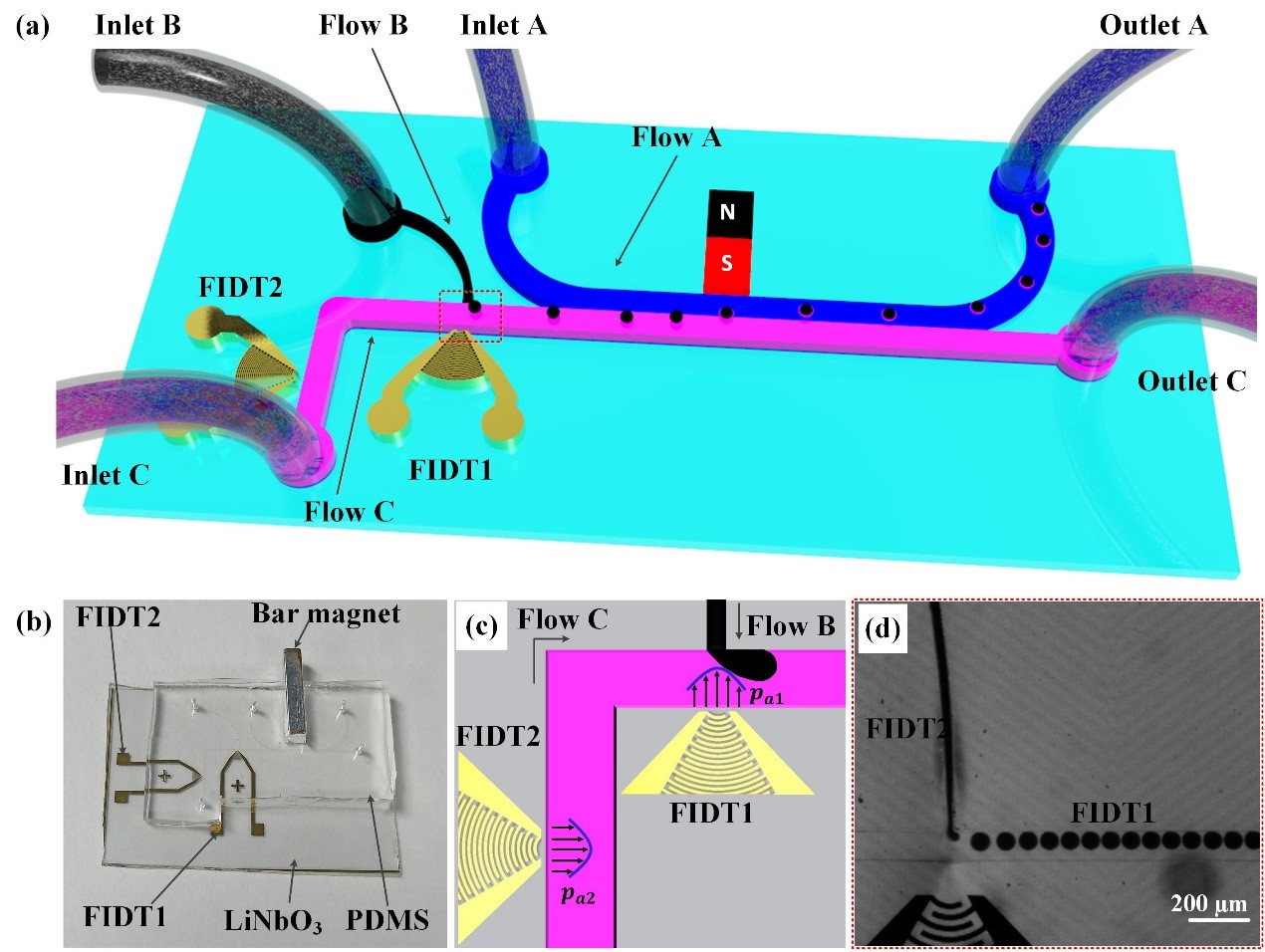 基于以上需求,陕西省微纳传感与测试技术创新团队开发了一种结合声场和磁场共同控制液滴生成技术和多相流技术,提出了一种新型的磁性荧光聚丙烯酰胺水凝胶微球和海藻酸钙水凝胶微球的制备方法。两个叉指式换能器位于两个不同的位置,分别调节界面变形和上游压力。将表面声波(SAWs)引入通道,不仅可以直接影响液滴(FIDT1)形成过程中相的界面稳定性,产生较小的液滴,还可以瞬间控制上下游侧(FIDT2)之间的压降和吞吐量,通过调整两个叉指换能器的输入参数,聚焦表面声波可以灵活地诱导不同尺寸的液滴的产生,实现更大的液滴尺寸调整范围。