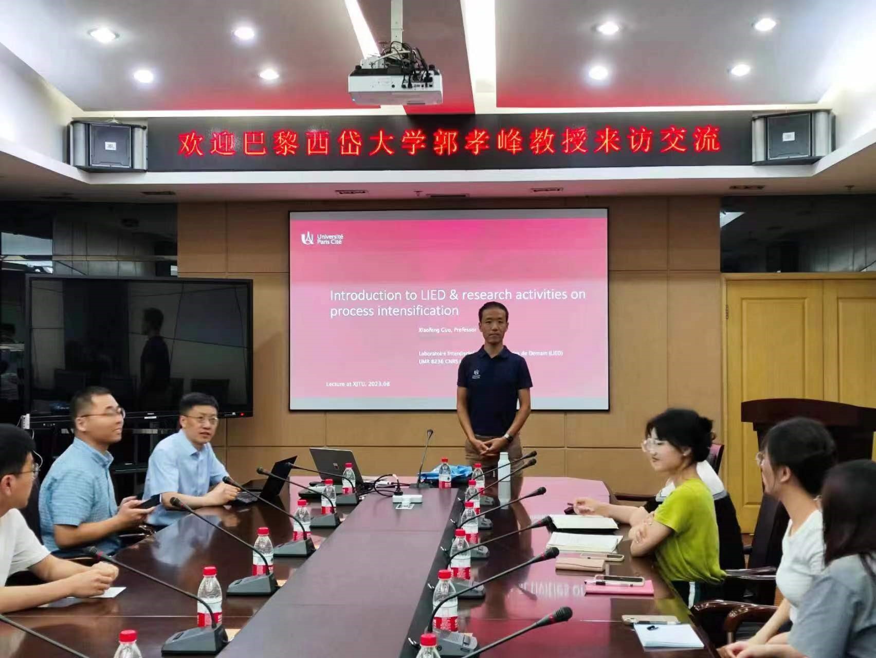 访问期间,郭孝峰教授为课题组成员做了题为 Introduction to LIED & Research activities on process intensification 的报告,介绍了法国LIED实验室 (Laboratoire Interdisciplinaire des Energies de Demain 跨学科未来能源实验室)的情况,低频振动的有趣现象以及在操控液滴上的应用。随后围绕科研合作、学术创新等方面与课题组老师和学生进行了深入的交流。