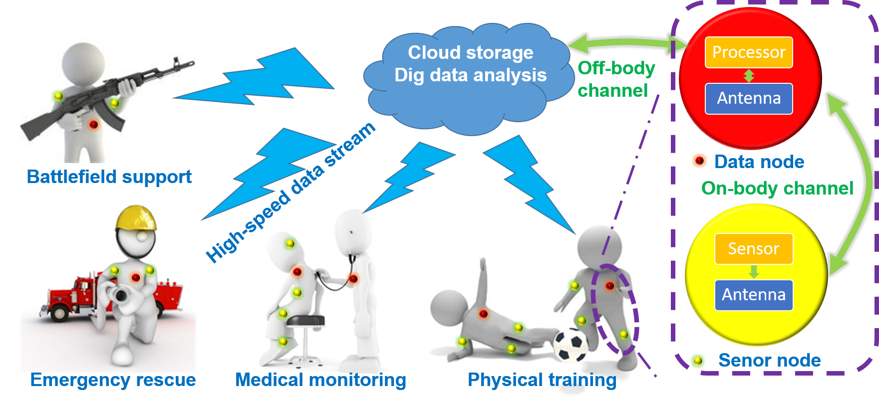 无线体域网(Wireless Body Area Network, WBAN)是一套附着在人体上的小型通信网络,可以实时得检测并传输多种生物传感器感知到的人体生物特性信号,因而在医疗监测、老幼看护、健身训练、抢先救灾、以及战场保障等军民领域有着十分广阔的引用前景,近年来引起了国内外学界和工业界的广泛关注。一个典型的体域网框架如下页图例所示。人体上佩戴的传感器可以实时的感知人体及其周围环境的参数,然后将这些数据传输到服务分析基站,从而实现对于人体各项体征的检测和监控。