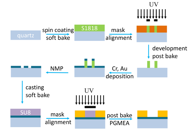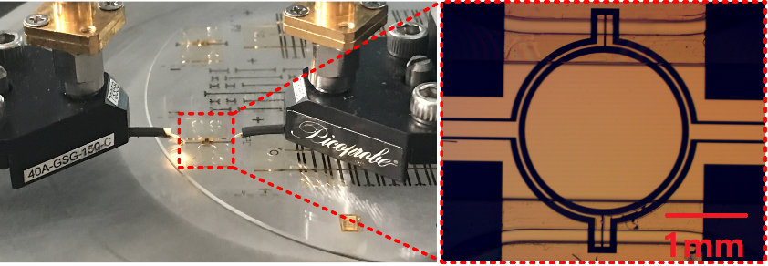 利用介质集成波导理论,设计了一款微波谐振式微流体传感器原型。通过使用左右手复合传输线的加载方式,在保持腔体品质因数不变的情况下,减小器件尺寸63%(Sens. Actuators A 283, 313, 2018)。该腔体谐振结构工作于-1阶模式,具有与传统腔体类似的场分布特性。由于腔体的测量灵敏度一般取决于被测样品和腔体体积之比,此设计可大大减少单次检测的样品使用量。研究了先进微纳加工技术在生物检测中的应用。引入微波差分式传感结构,集成设计微流体沟道与环形谐振单元,并通过基于MEMS的紫外光刻工艺(UV-LIGA)制备了一款一体式微流体感测芯片,系统工作在20GHz,可对45pL量级的微量液体进行精确测量(IEEE Sens. Lett. 3, 4500604, 2019)。这项成果可应用于化学试剂分析、细胞识别计数、血液元素测量、细菌病毒观测等诸多生化医疗领域。