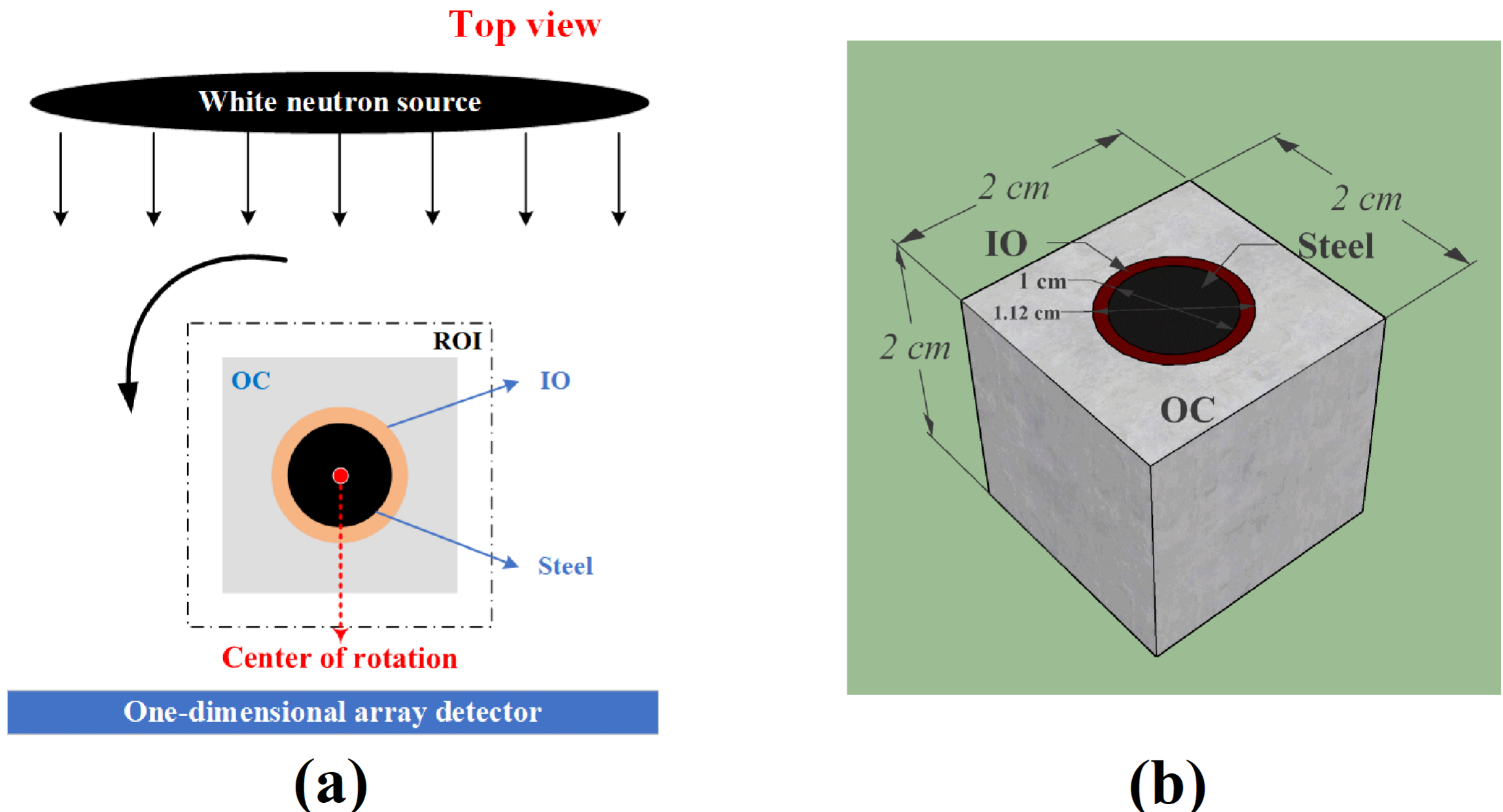 图三、CT扫描示意图(a),锈蚀钢筋混凝土样品设计(b)