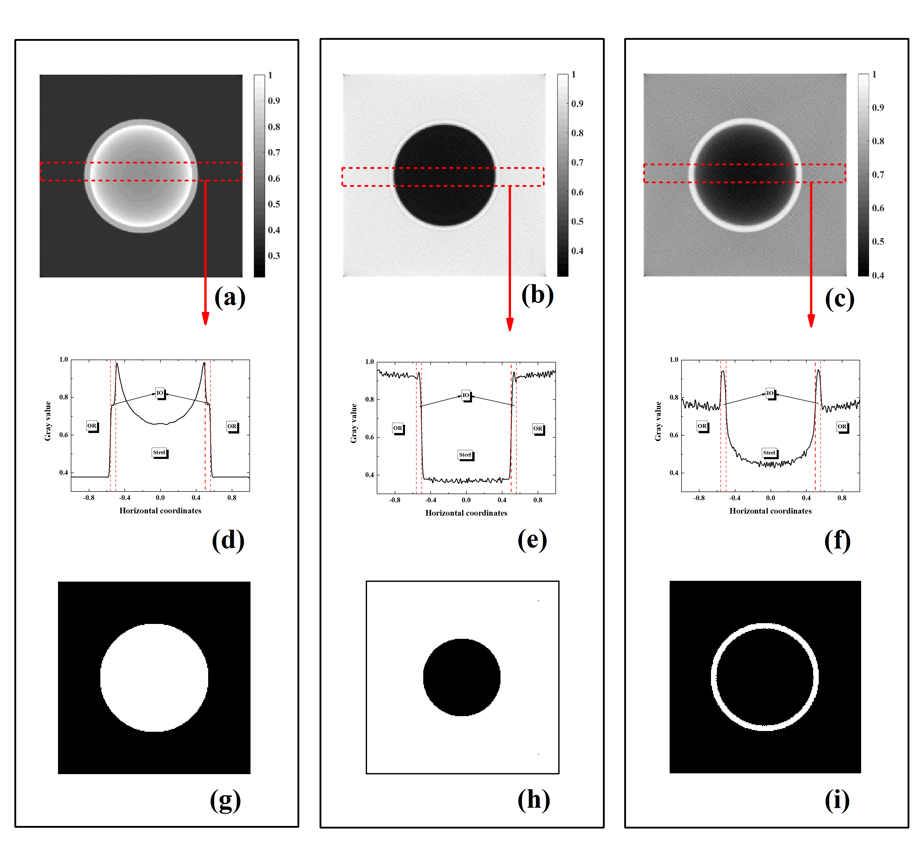 CT扫描的方式如图三所示,间隔一度获得一组扫描数据,对透射的白光中子分别按照56Fe和16O的共振峰进行能量筛选,再进一步处理得到关联56Fe和16O共振峰的投影数据PFe和PO,以及关联氧化物的投影数据PIO。分别进行CT重建后结果如图四所示,结果表明,在投影数据相空间,核素/元素的共振特性可以通过投影数据进行叠加,基于此,可以成功地实现铁氧化物识别成像。