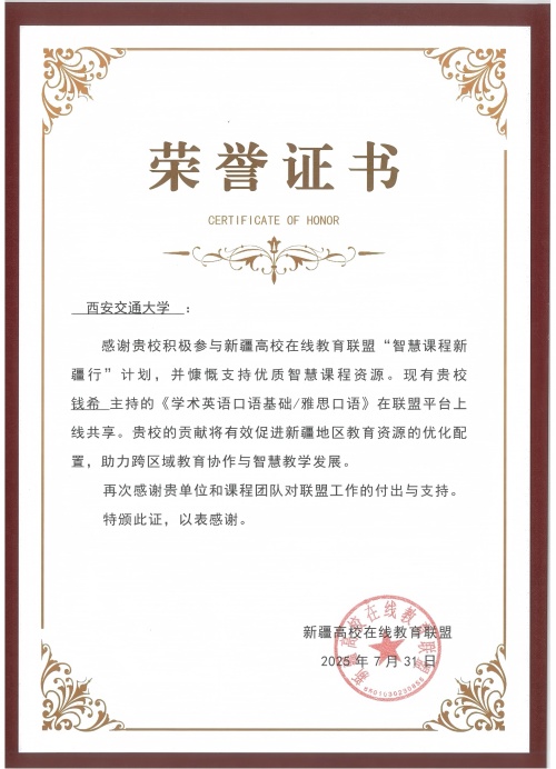 近日,新疆高校在线教育联盟公布首批“智慧课程新疆行”上线课程名单,本科学术英语教学团队的智慧课程“学术英语口语基础”(校本专项课名为“雅思口语”)成功入选。该课程将在新疆高校在线教育联盟上线推广,这一课程共享将为促进新疆地区教育资源的优化配置,助力跨区域教育协作与智慧教学发展做出“西交大”的独特贡献。