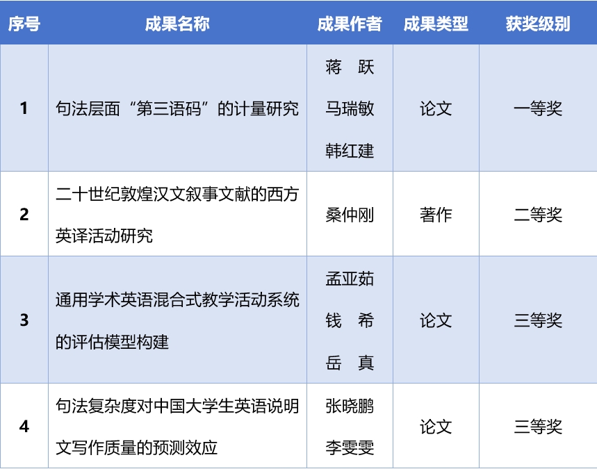 12月1日,陕西省第十六届哲学社会科学优秀成果奖揭晓。外国语学院共有4项成果获奖,其中一等奖1项,二等奖1项,三等奖2项,实现了一等奖的突破。