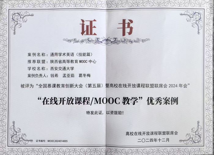 大会由教育部高等学校教学信息化与教学方法创新指导委员会指导,高校在线开放课程联盟联席会主办,并由高校计算机教育MOOC联盟等27个联盟类组织承办。会议的核心目标是展示我国在线开放课程数字教学资源与教学改革的优秀案例,推广“X+在线开放课程”和“AI+课程教学”的典型应用场景,挖掘特色应用,发挥示范引领作用,积极推动多模态智慧教学实践,拓展高校教学与人才培养的新途径。“通用学术英语(技能篇)”案例经过学校推荐、陕西省高等教育MOOC中心评选,推荐至高校在线开放课程联盟联席会参加最终遴选,经过激烈的角逐,最终获评“在线开放课程/MOOC教学”优秀案例,该奖项在全国高校在线课程领域极具影响力。