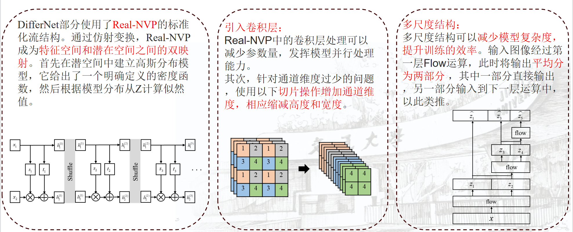 DifferNet设计原理:DifferNet通过对卷积神经网络提取的图像特征进行精确的梯度密度估计,其存在一个双射映射之间的特征空间和潜在空间,其中每个映射向量被分配到一个似然度,设计评分函数来决定一个图像是否包含一个异常。