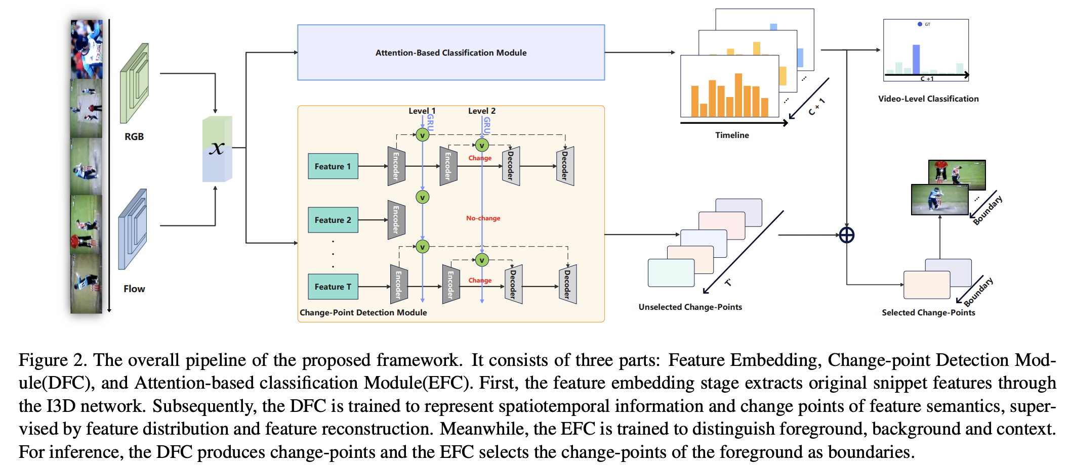 Weakly-Supervised Action Localization by Hierarchically-structured Latent Attention Modeling(作者:Guiqin Wang, Peng Zhao, Cong Zhao, Shusen Yang, Jie Cheng, Luziwei Leng, Jianxing Liao, Qinghai Guo*)。该工作提出了一种新的基于注意力层次结构的隐变量模型来学习特征语义的时间变化,其主要包含两个组成部分,第一个是无监督的变化点检测模块,通过学习基于时间层次的视频特征的隐变量表示来检测变化点,第二个是基于注意力的分类模型,该模型选择变化点的前景作为动作边界。通过在两个基准数据集THUMOS-14和ActivityNetv1.3的验证,表明该方法达到了目前弱监督领域最先进的方法,甚至达到了与全监督方法相近的性能。