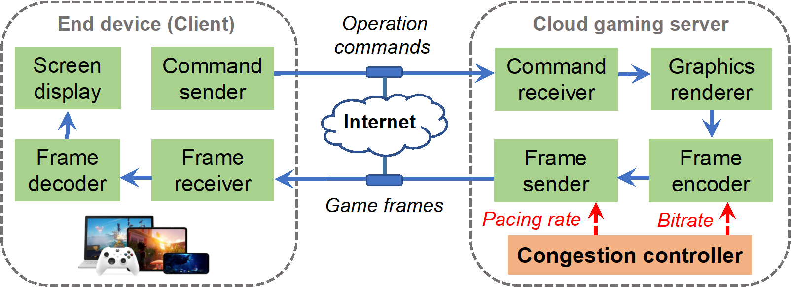 Pudica: Toward Near-Zero Queuing Delay in Congestion Control for Cloud Gaming(作者:Shibo Wang, Shusen Yang*, Xiao Kong, Chenglei Wu, Longwei Jiang, Chenren Xu, Cong Zhao, Xuesong Yang, Jianjun Xiao, Xin Liu, Changxi Zheng, Jing Wang*, and Honghao Liu)。该工作提出面向云游戏的超低时延拥塞控制算法,通过精准的带宽利用率预测和敏捷的码率控制,在毫秒级尺度实现快速收敛至效率与公平。通过大规模产品级线上实验(超过5000真实云游戏用户),该算法降低平均传输时延3x,降低云游卡顿率8x,提升游戏码率23%。该算法已在腾讯公司START云游戏平台部署运行至今。https://www.usenix.org/conference/nsdi24/presentation/wang-shibo