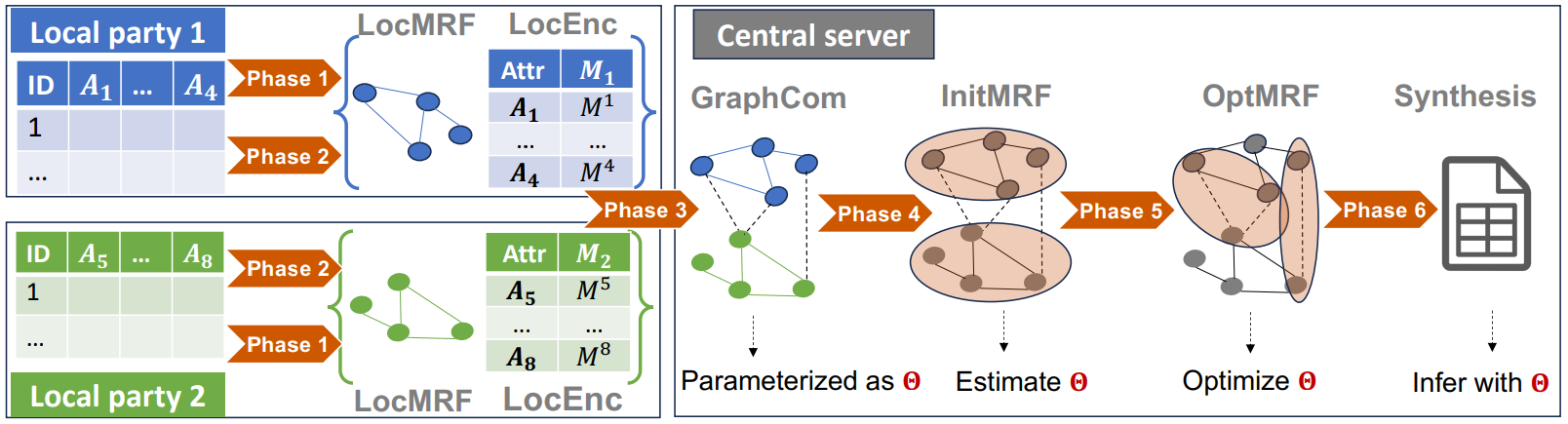 VertiMRF: Differentially Private Vertical Federated Data Synthesis(作者:Fangyuan Zhao, Zitao Li, Xuebin Ren, Bolin Ding, Shusen Yang* and Yaliang Li)。该工作提出了一种面向纵向联邦学习场景的数据合成框架VertiMRF,该框架基于马尔科夫随机场对属性间的相关性进行建模,并采用DP FM-Sketch以及随机响应等差分隐私方案实现隐私保护的跨节点相关性分析。为了提升性能,提出了基于特征分箱的维度缩减以及相关的维度一致性调整算法。通过在大量现实数据上进行对比验证以及消融实验,我们发现相比于已有方法,VertiMRF能够在相同的隐私预算下显著提升模型效用性,并且这种优势关于不同的数据分布是鲁棒的。https://arxiv.org/abs/2406.19008