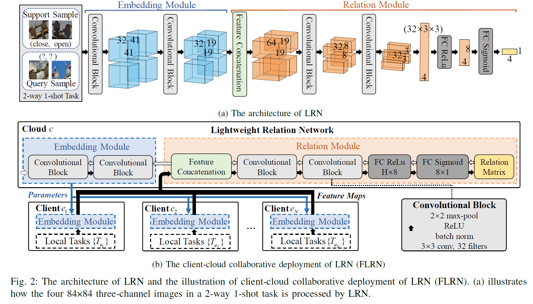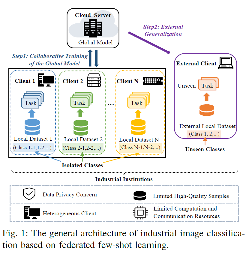 Lightweight Industrial Image Classifier based on Federated Few-Shot Learning(作者:Xinyue Sun, Shusen Yang, Cong Zhao)。该工作提出了一种轻量小样本工业视觉模型FLRN。首先,提出了首个跨样本稀缺工业数据孤岛的联邦小样本学习框架,在保护数据隐私的前提下充分利用稀缺工业样本进行模型训练。再者,设计了一种轻量工业视觉模型FLRN及其边云协同训练方法,显著降低边缘设备的模型训练开销。最后,在晶圆缺陷检测、变电站智能运维等多个真实工业视觉场景中全面验证了所提出方法的有效性:FLRN在达到与业界最优方法相当的模型精度的同时,降低了高达95%的边缘设备资源开销。