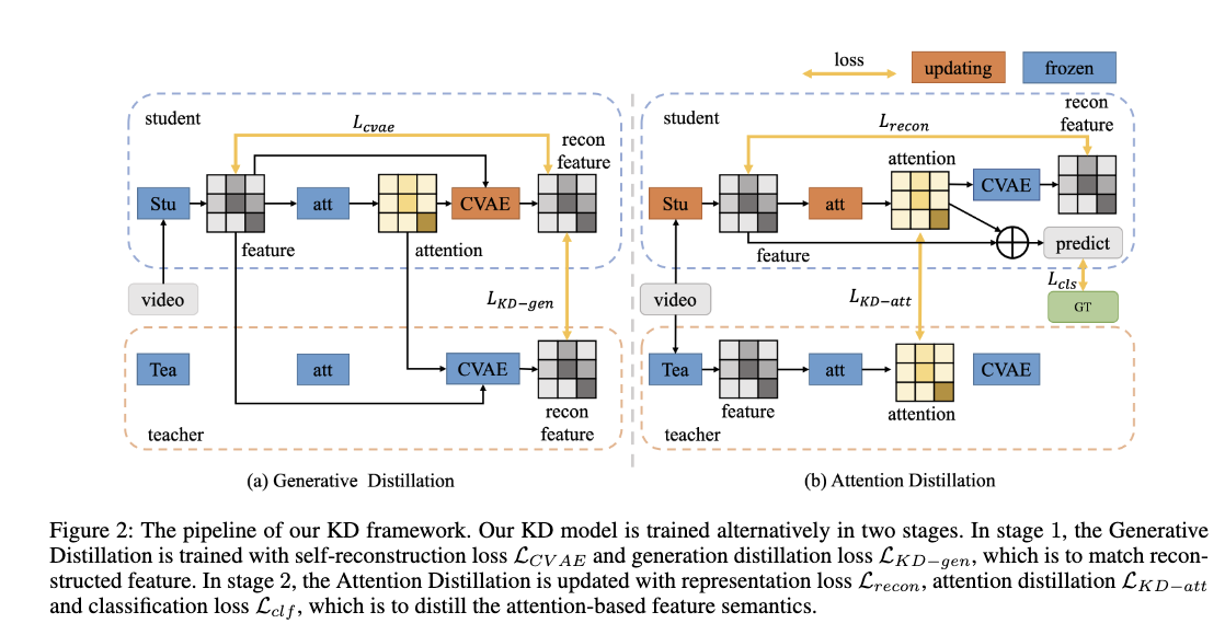 Generative Model-based Feature Knowledge Distillation for Action Recognition(作者:Guiqin Wang, Peng Zhao*, Yanjiang Shi, Cong Zhao, Shusen Yang)。该工作在动作分析领域首次提出用于模型轻量化的知识蒸馏算法。该算法分为两个步骤:首先是特征建模部分,其训练基于生成模型的注意力模块来表征特征语义;其次是基于生成的特征蒸馏阶段,该阶段包括生成蒸馏和注意力蒸馏两个子模快,目的是通过生成模型转移基于注意力的特征语义。实验部分通过在动作识别领域的通用数据集上均证明了方法的有效性,同时在更为复杂的视频动作检测任务中进一步验证了本算法框架的有效性。代码开源于:https://github.com/aaai-24/generate-based-kd。https://arxiv.org/abs/2308.09946