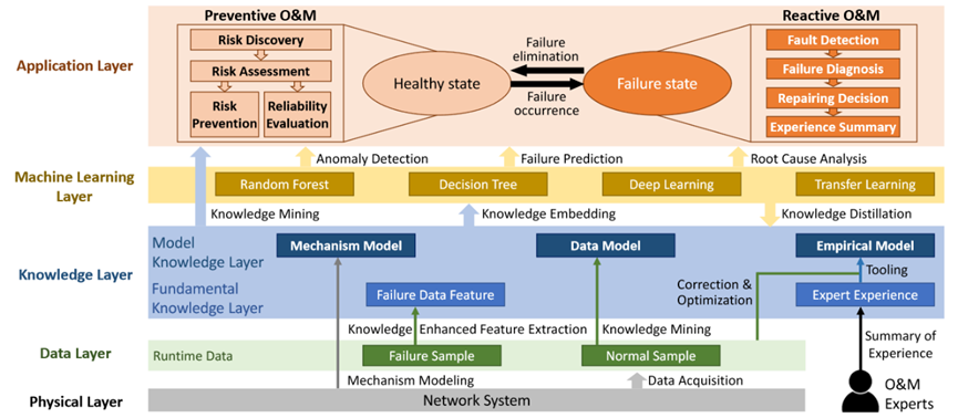 TelOps: AI-driven Operations and Maintenance for Telecommunication Networks(作者:Yuqian Yang, Shusen Yang, Cong Zhao and Zongben Xu)。针对大规模复杂电信网络拓扑依赖、高度异构、故障数据获取有限的问题,该工作首次提出了一种AI驱动的基础网络设施运维框架。图1给出其分层架构图。该系统性框架从上到下分为任务、机器学习、知识、数据、物理五层,通过层层分解任务需求,结合电信网络及其运维任务中的特性,给出了主流运维任务的具体设计指导性思路。在典型场景无线接入网中的故障诊断下的高效根因告警定位需求下,以此框架设计解决方案,在真实场景下的530万告警数据中进行验证,测试结果表明,该智能运维框架可以有效支撑真实运维需求设计,故障根因告警识别准确率明显优于现有方法,在最重要的典型网络高峰使用场景下,对比现有运营商方案、典型机器学习方法和遵循AIOps设计的解决方案分别高达28%、20.1%和15.8%。https://arxiv.org/abs/2412.04731