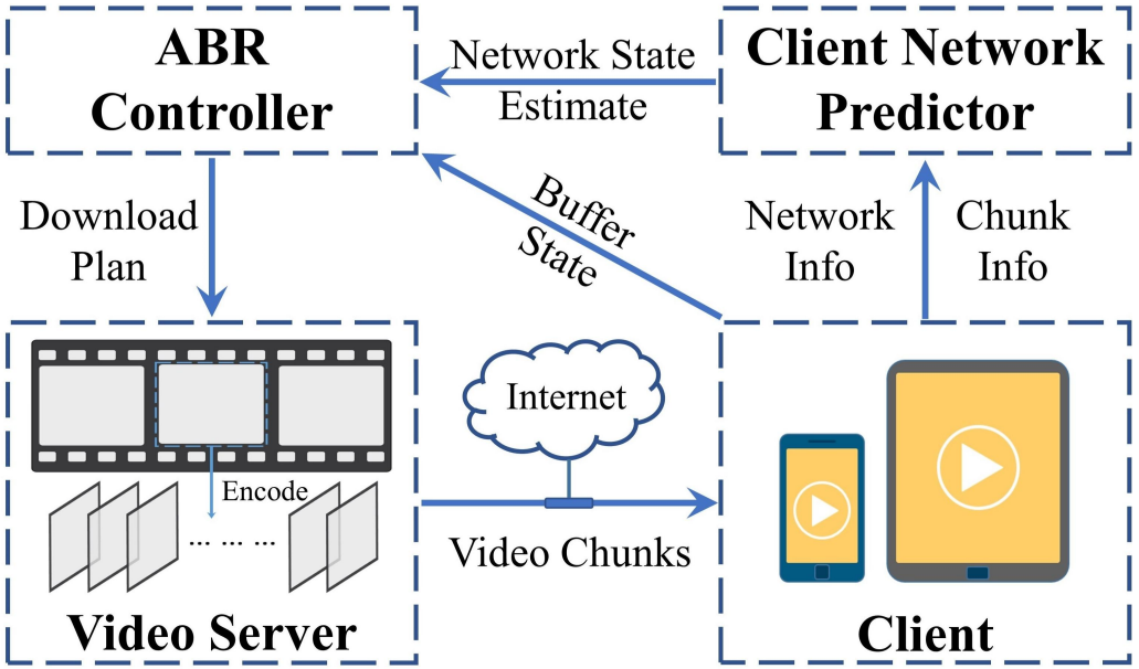 Reducing Traffic Wastage in Video Streaming via Bandwidth-Efficient Bitrate Adaptation (作者: Hairong Su, Shibo Wang, Shusen Yang, Tianchi Huang, Xuebin Ren)。针对自适应视频流系统中的流量浪费问题,该工作提出了一种带宽高效的码率自适应算法 BE-ABR。该研究首先将流量浪费感知的码率自适应问题形式化建模为一个随机优化问题,然后提出了基于Transformer的时间感知的传输延迟预测器(T3P),以实现对视频块传输时延的精准预测。接着,作者设计了一种细粒度的自适应码率控制逻辑,通过联合决策视频块质量等级和块间等待时间,来平衡流畅播放和带宽利用效率。在基于DASH的视频流媒体测试平台上,进行的超过500小时的WiFi和蜂窝网络环境实验表明,BE-ABR在整体传输性能(QoE和带宽利用率)方面显著优于多个基准方案。