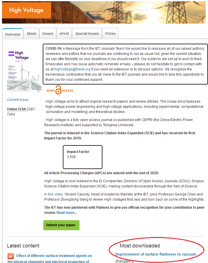 《High Voltage》自2016年4月创刊,创办单位为中国电力科学研究院(CEPRI)、英国工程技术学会(IET)和清华大学共同合作。作为首个专注高电压领域研究的英文期刊,采用全数字化的开放获取出版模式,以最快捷、便利的方式让有价值的学术论文被感兴趣的读者获取,核心内容为“高电压、大电流、强电磁场”。目前High Voltage的所有正式出版文章已经被ESCI收录。