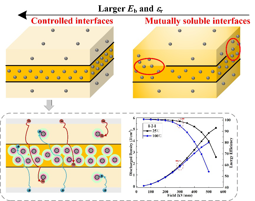 在众多储能设备中,电介质电容器具有功率密度大、充放电速度快、工作电压高、使用寿命长等优点,然而较低的储能密度制约了其应用前景。近年来,多层结构成为提高电介质材料储能密度的研究热点。针对聚酰亚胺/钛酸钡纳米复合电介质,该研究提出了一种通过逐层热酰亚胺化来制备多层材料的新方法,相比于常规热酰亚胺化方法制备出的多层材料,该方法所制试样具有更规整的界面结构、更有序的纳米粒子分布以及更好的块体致密性,从而获得更高的击穿强度和储能密度,尤其是具有很好的热稳定性。其常温和高温(100 oC)的放电储能密度分别约5.1 J/cm3和3.9 J/cm3。该研究还提出了一个基于双极性电荷输运的机理模型,从微观角度解释了三层结构和这一全新制备方法能够有效提高电介质材料击穿强度的具体机理。