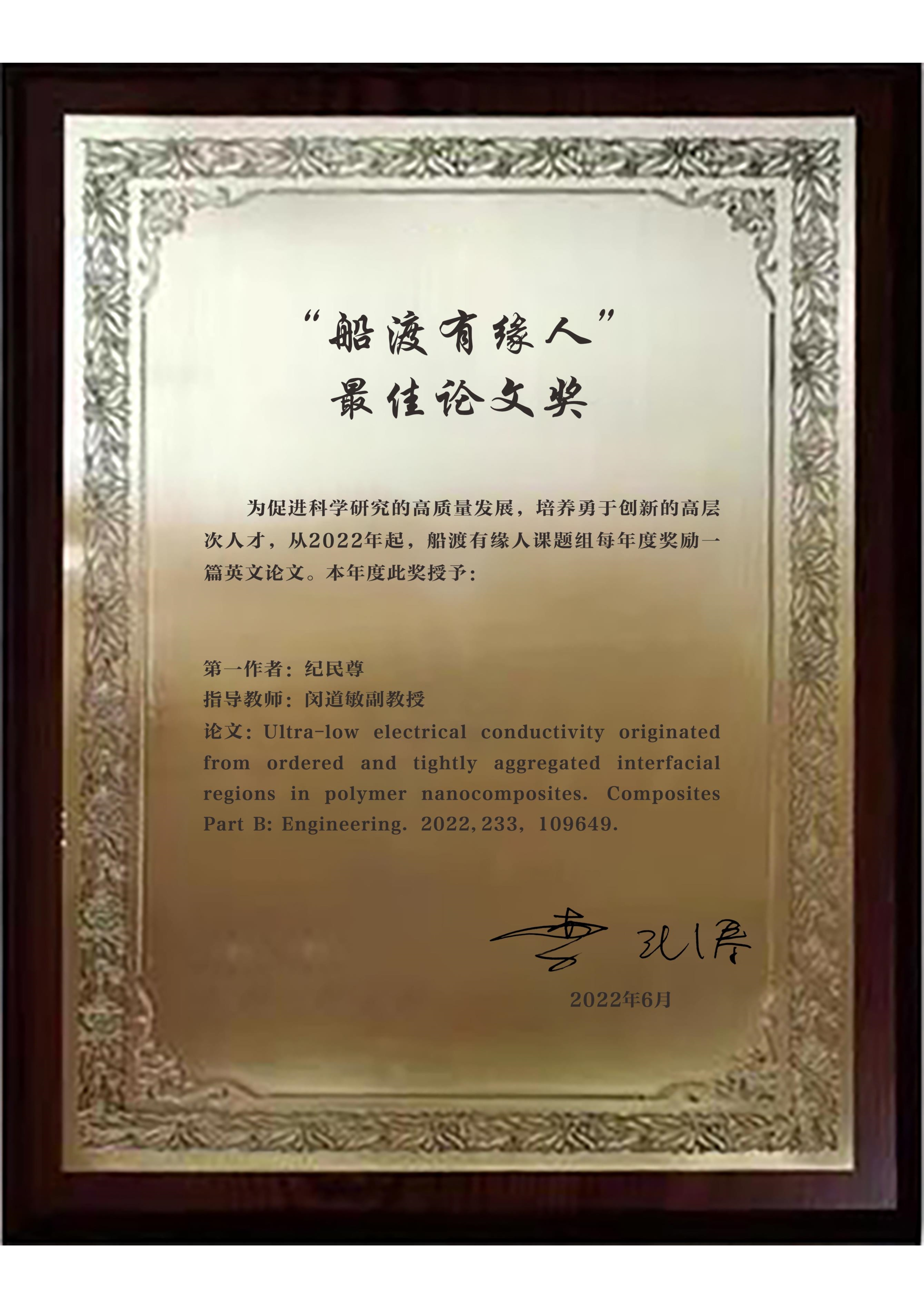 2022年度船渡有缘人课题组最佳英文论文奖获得者为博士生纪民尊,指导教师闵道敏副教授;最佳中文论文奖获得者为硕士生王瑶,指导教师李建英教授。祝贺他们!