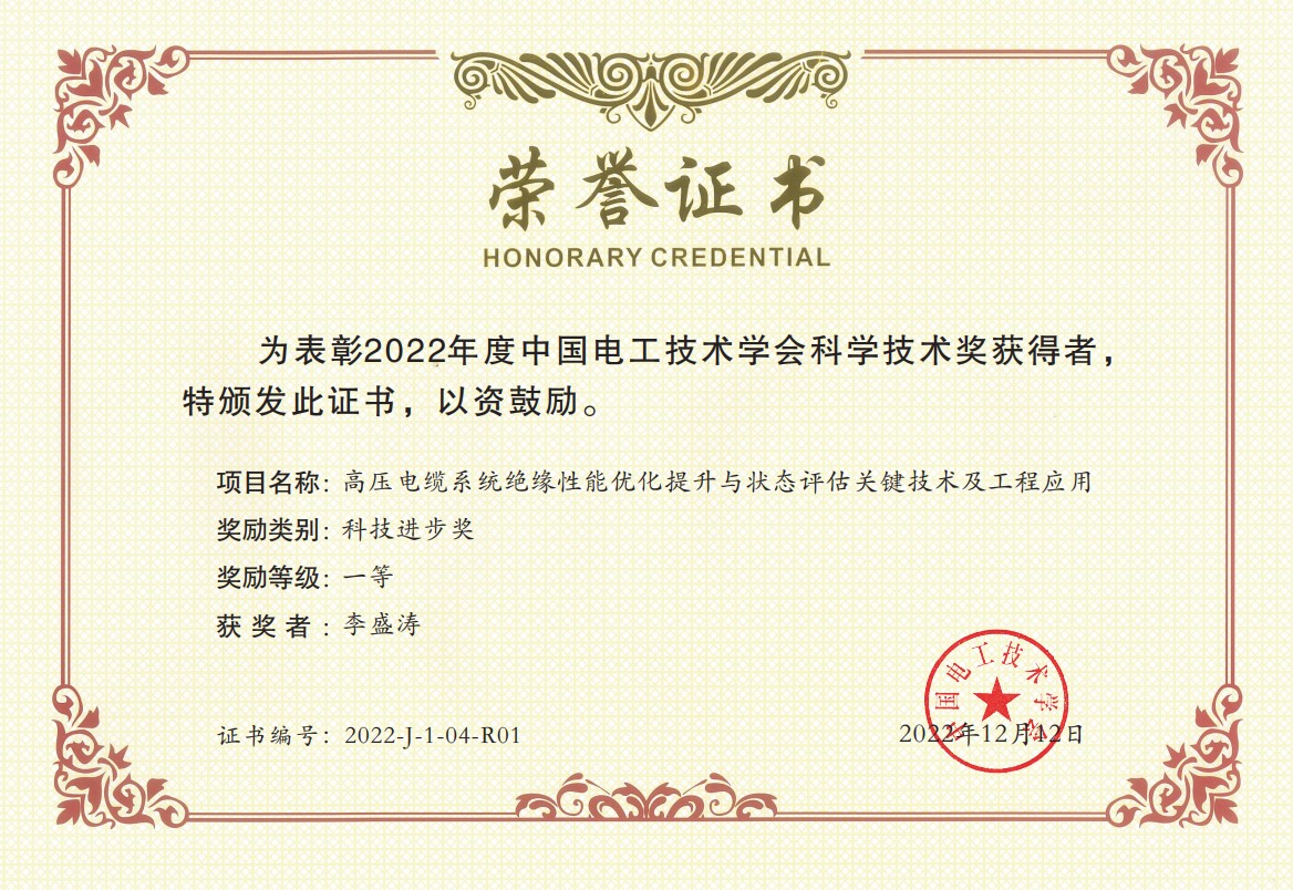祝贺李盛涛教授荣获2022年度中国电工技术学会科学技术奖(科技进步一等奖)