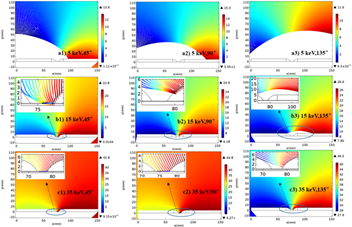 图中. 聚酰亚胺外施电压18.7 kV时,不同能量和入射角度的电子束运动轨迹