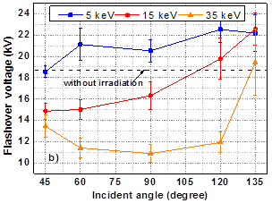 图左. 聚酰亚胺真空直流沿面闪络电压与电子束辐射角度和能量的关系