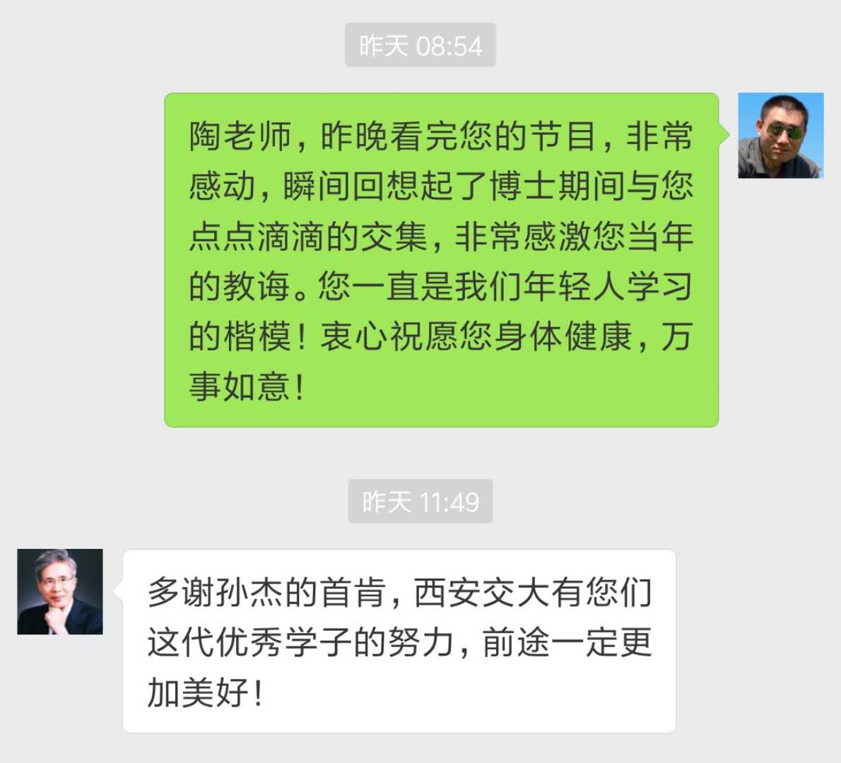 怀着无比激动的心情观看了陶老师《开讲啦》节目的首播,节目结束后第二天按耐不住仍然激动的心情给陶老师发去了微信并收到了回复: