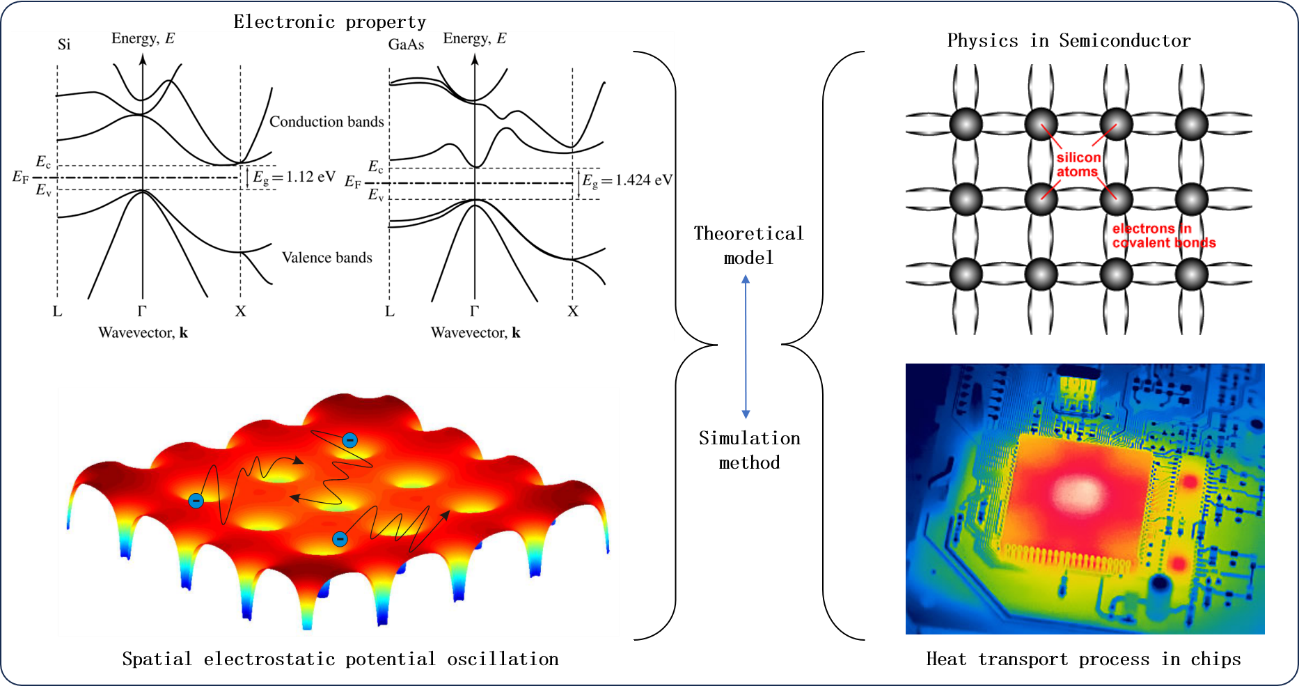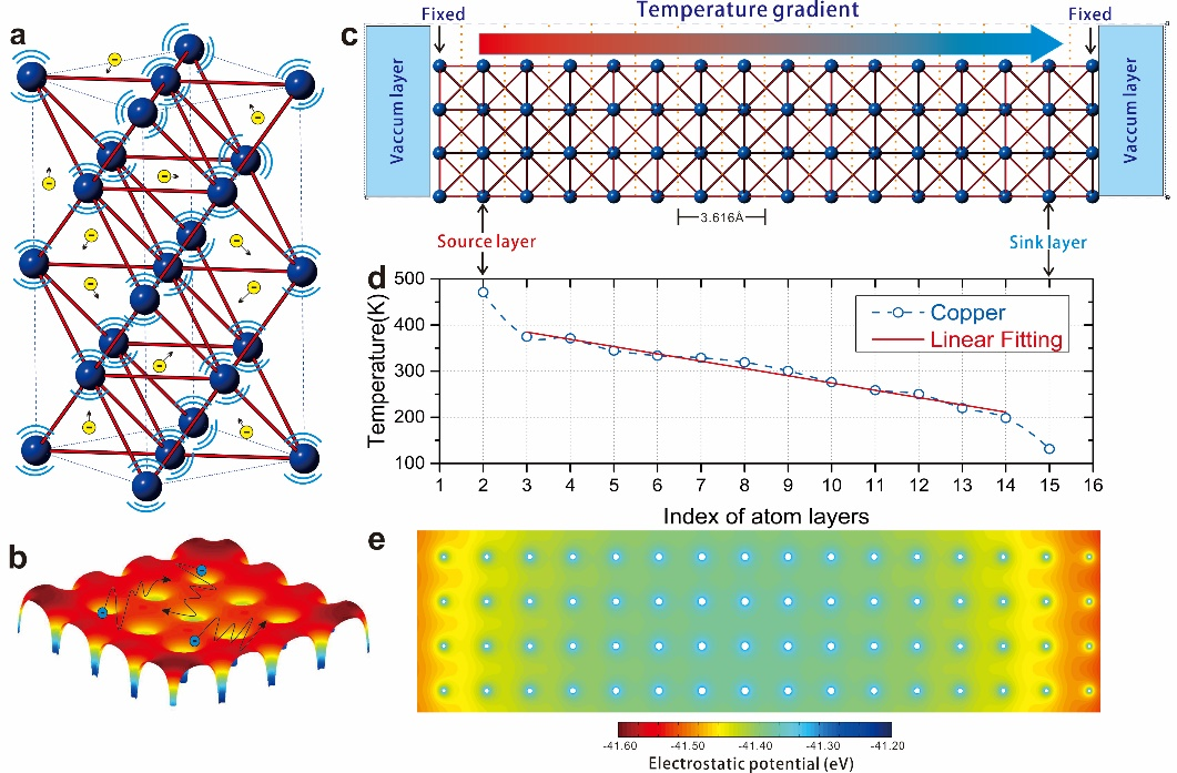图3. 结合电子能带结构、Drude自由电子模型、空间静电势振荡理论,发展理论模型、计算模拟方法。探究半导体中电子导热的微观机理,为大规模集成芯片的导热设计提供原子尺度理论指导。