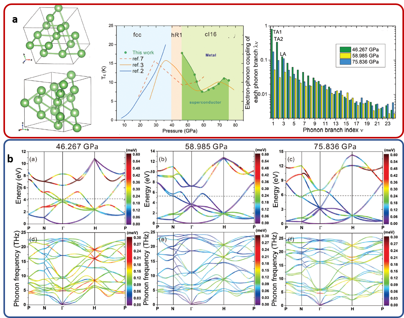 图6. 高压下的cI16相的金属Li的晶格结构,超导转变温度随压强的相图,不同压强下各个声学支中电声耦合强度。