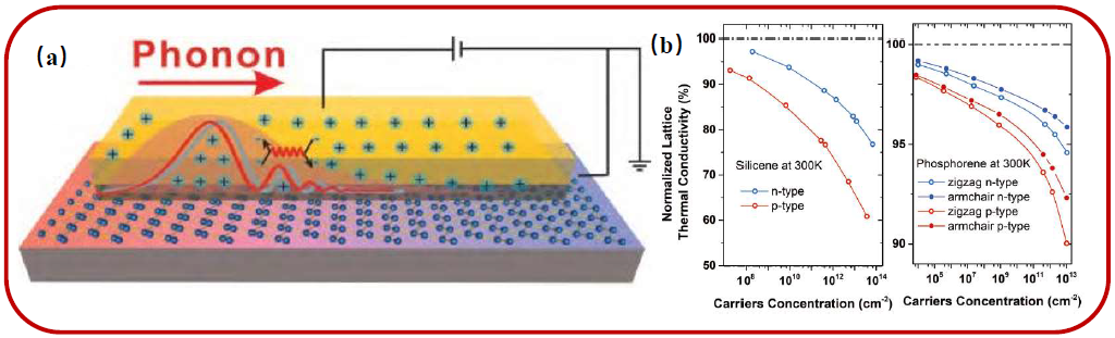 图9. 二维材料引入极端电场的原理示意图,黑磷烯和硅烯的声子热导率随外加电场强度的调控。
