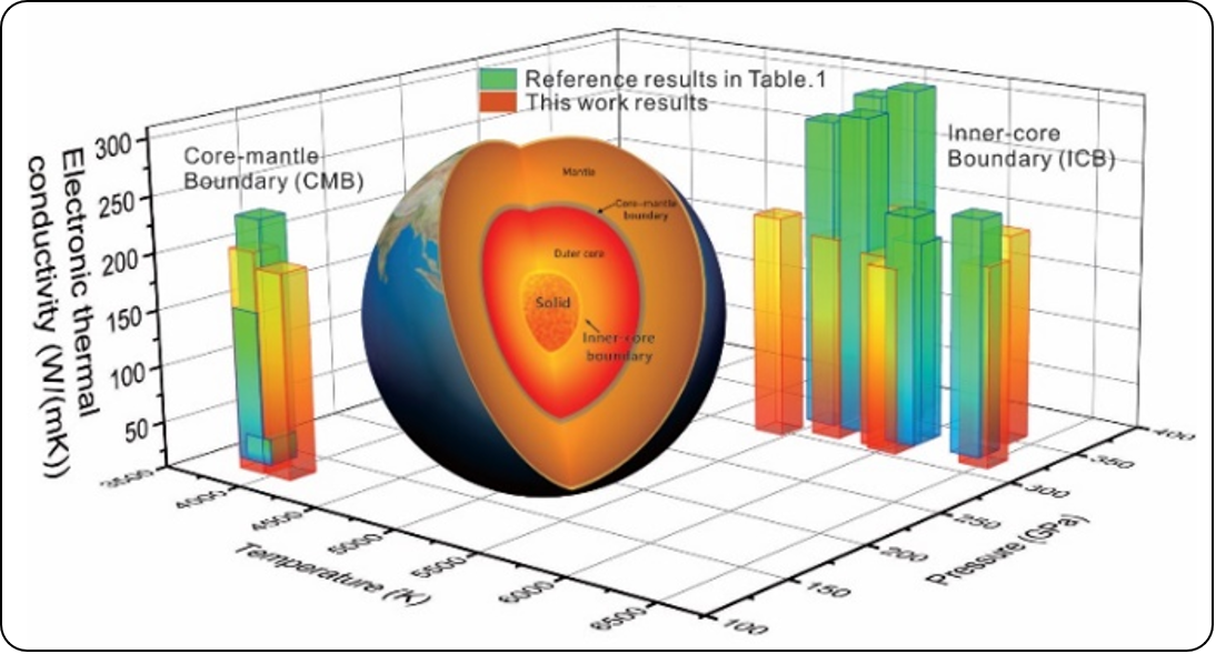 图4. 地心高温高压极端环境模拟,以及利用非平衡第一性原理分子动力学-静电势振荡方法计算的地心铁核热导率。