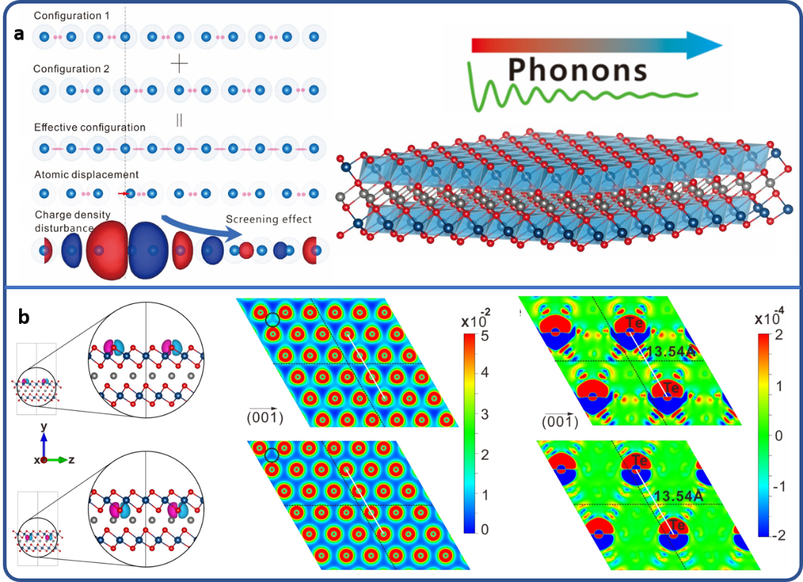 图5. 材料原子共振键作用原理示意图,以及研究声子输运的二维材料Bi2PbTe5分子模型,表面静电屏蔽对二维材料Bi2PbTe5中的原子间共振键作用强弱的影响。