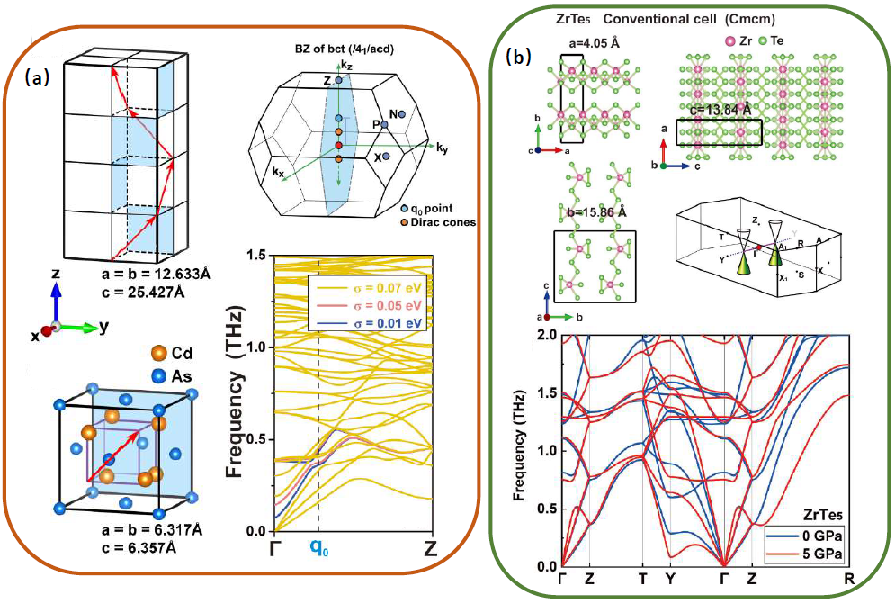 图10. 拓扑狄拉克材料Cd3As2中由电声耦合作用引起的声子科恩反常物理现象,拓扑狄拉克材料ZrTe5中由电声耦合作用引起的声子科恩反常物理现象。