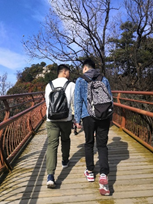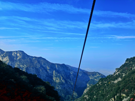 第一幅作品中,崔成超和赫文强师兄弟二人,一边赏景一边交谈甚欢,宛若相识多年的朋友。另外一幅优秀作品为乘坐缆车时所拍,三座山峰层峦叠嶂,天空中几缕薄云显得恢弘悲壮,画面中一条长长的索道,更突显景色之壮阔,视野之广阔,令观者心旷神怡、宠辱偕忘,不禁联想到一句古诗:“少华连延翠烟永,细路缘云上高顶。”