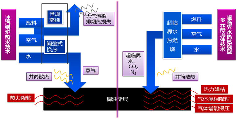 稠油是指在油层条件下原油粘度大于50 mPa·s,原油密度大于0.92 g/cm3的原油。中国海上稠油资源丰富,仅渤海湾海上油田储量高达24亿吨,高效开采稠油是解决当前中国原油对外依存度高的重要途径。热采技术是稠油开采领域普遍使用的手段之一,但仍存在热效率低、蒸汽发生器占地面积大、运行成本高等问题。在此背景下,本团队提出超临界多源多元热流体技术。