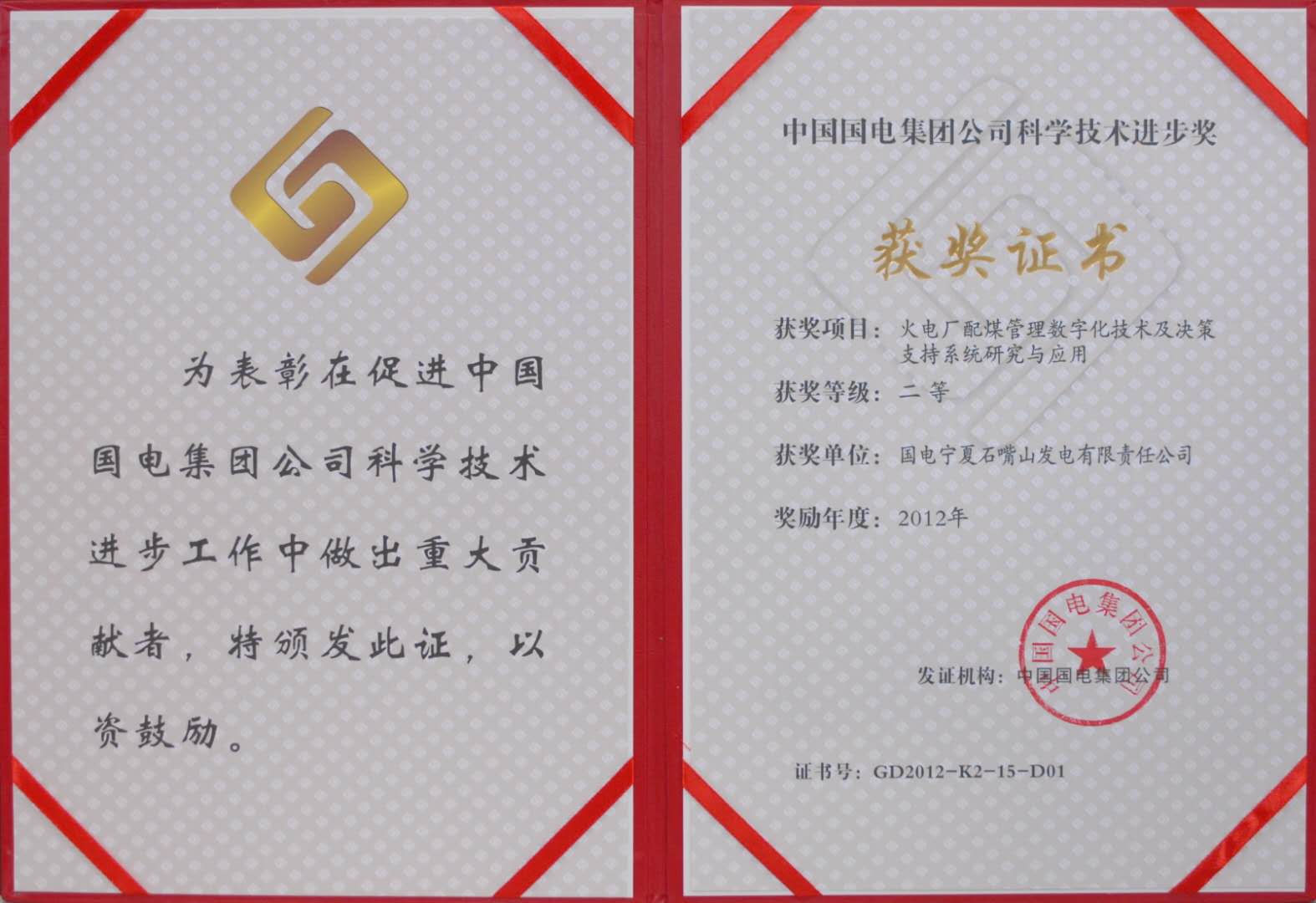 谭老师与国电宁夏石嘴山发电有限公司作为共同申报人,荣获2012年度中国国电集团公司科学技术进步二等奖。