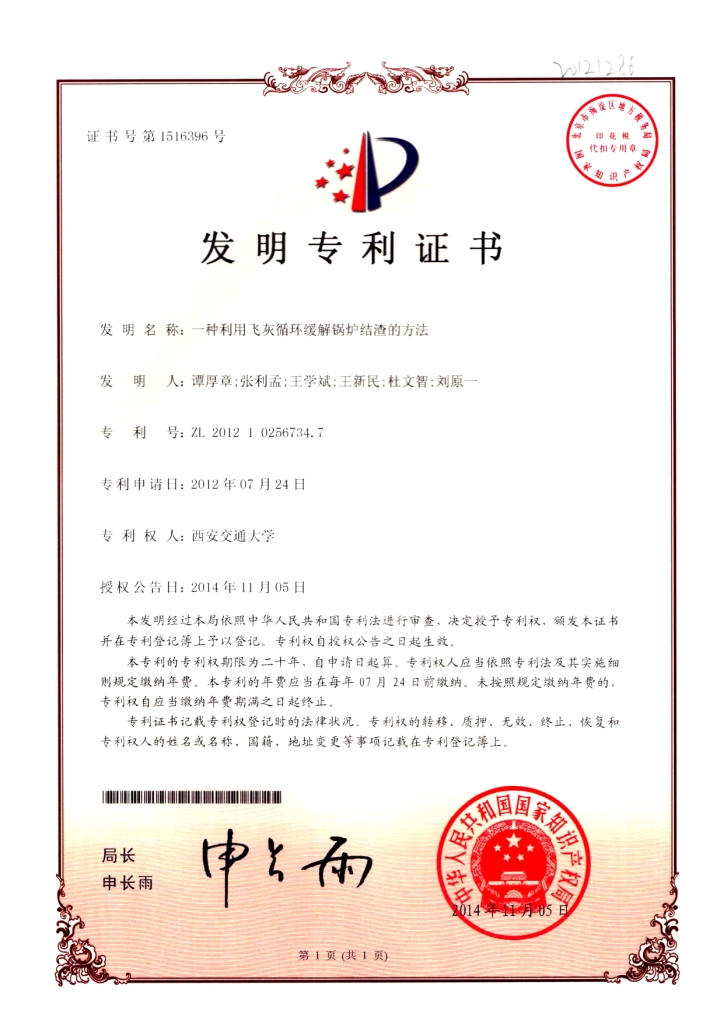 针对电站锅炉存在的结渣结焦问题,我课题组结合实际研究经验,率先提出一种利用飞灰循环缓解锅炉结渣的方法,日前获得国家发明专利授权。