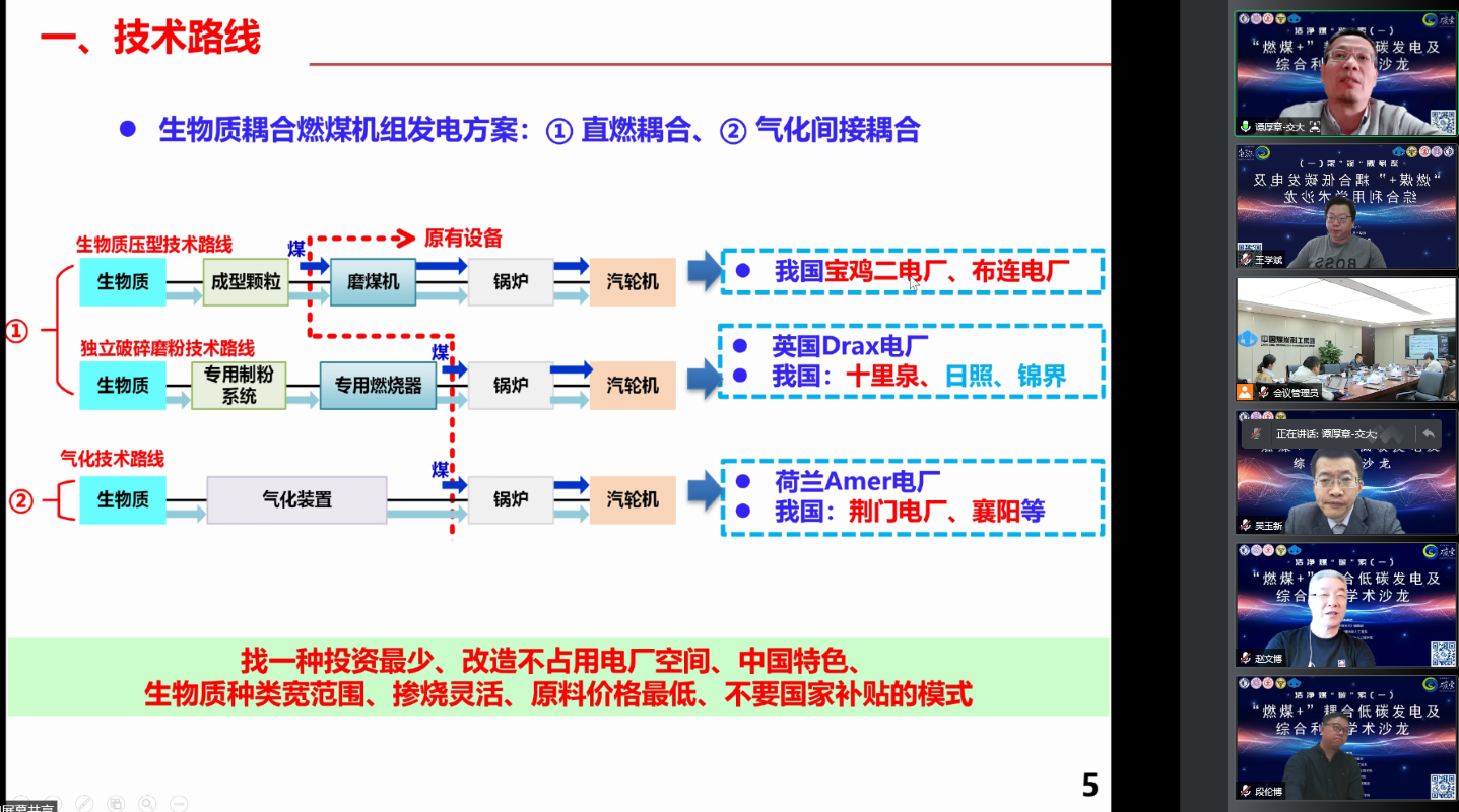 随着全球对气候变化的日益关注,CO2减排成为能源电力领域发展的重大关切。为分享燃煤低碳发电利用的最新技术成果,分析生物质耦合发电及低碳燃料替代技术领域的未来发展趋势,碰撞思维,探讨燃煤低碳发电技术的潜在问题及解决措施,《洁净煤技术》编辑部会同清华大学能源与动力工程系、西安交通大学能源与动力工程学院、东南大学能源与环境学院,于2022年4月23日共同举办洁净煤“碳”索(一)——“燃煤+”耦合低碳发电及综合利用学术沙龙,为我国燃煤低碳发电技术的发展尽绵薄之力。王学斌教授主持会议,谭厚章教授作“利用现有制粉系统的生物质规模化耦合掺烧技术及示范”学术报告、王学斌教授作“多源有机固废无氧热解碳化灵活性耦合技术”学术报告。