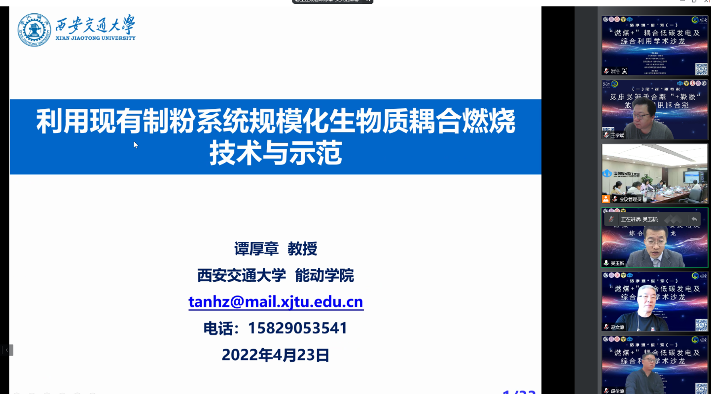- 谭厚章和王学斌教授受邀在“燃煤+”耦合低碳发电及综合利用学术沙龙作学术报告,王学斌教授主持会议