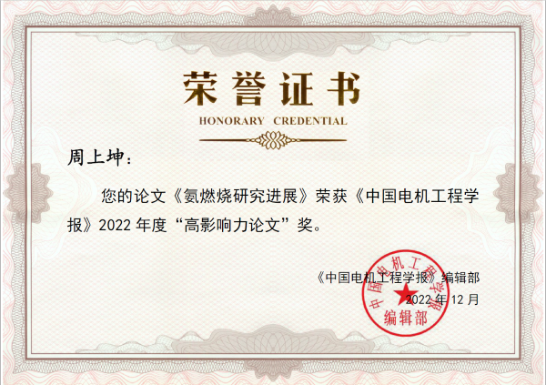 课题组一篇综述论文《氨燃烧研究进展》荣获《中国电机工程学报》2022年度“高影响力论文”奖