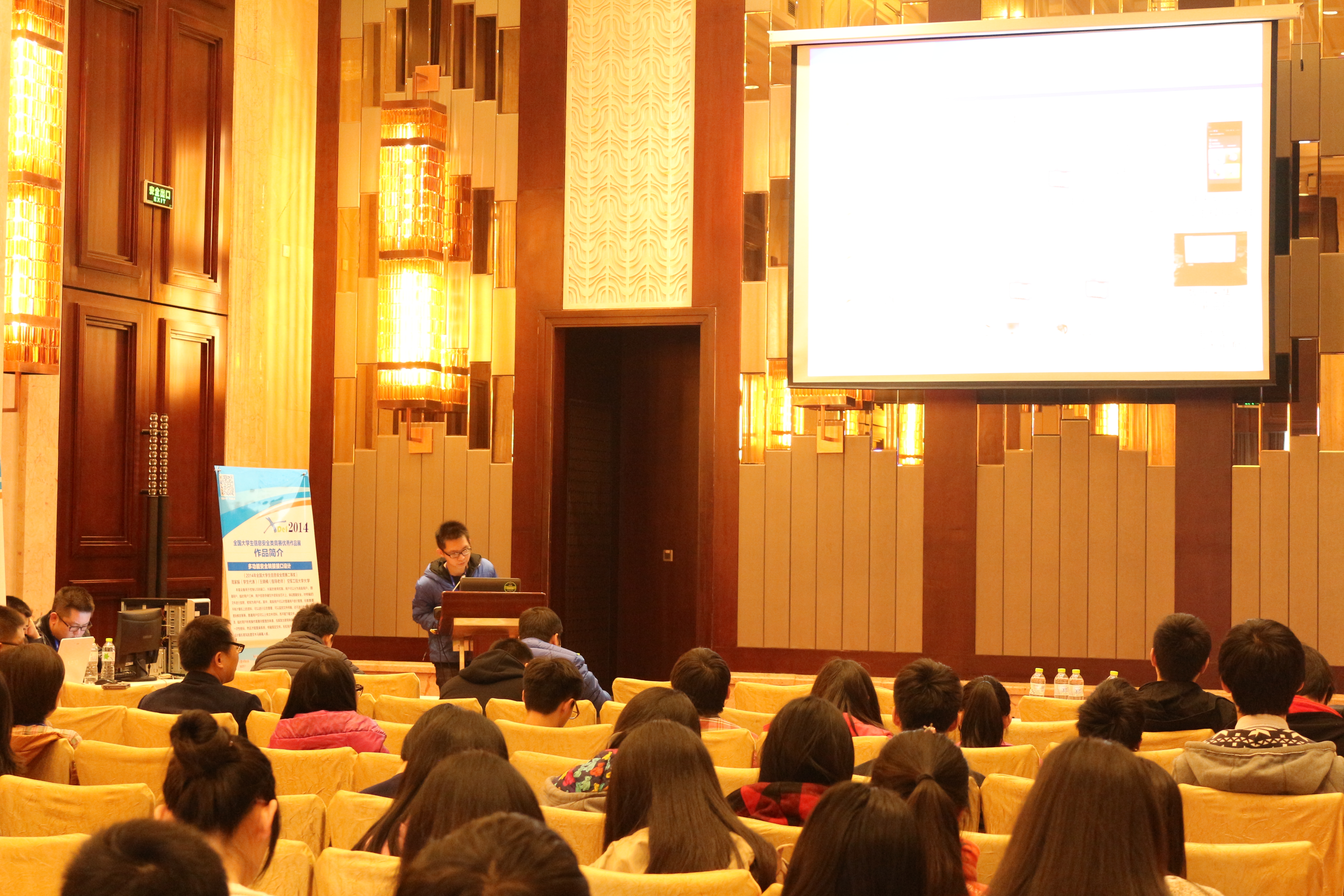 两位同学在大学生信息安全优秀作品环节,展示介绍了本实验室(智能网络与网络安全实验室)在基于物理信息融合的智能电网攻击检测系统的研究成果。