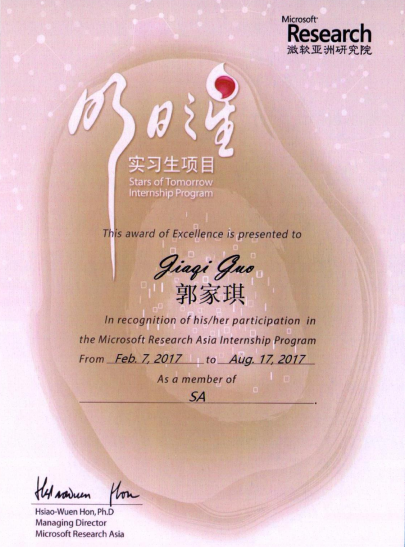 祝贺郭家琪同学获得微软亚洲研究院“明日之星”奖