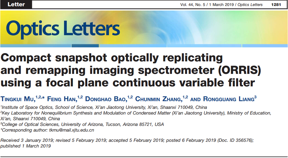 科研进展:课题组《Optics Letters》发表微小型快照式高光谱实时成像技术及系统(ORRISp)