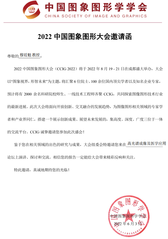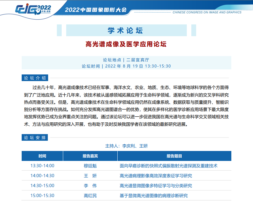 学术会议:受邀参加2022中国图象图形大会-高光谱成像及医学应用论坛(特邀报告)