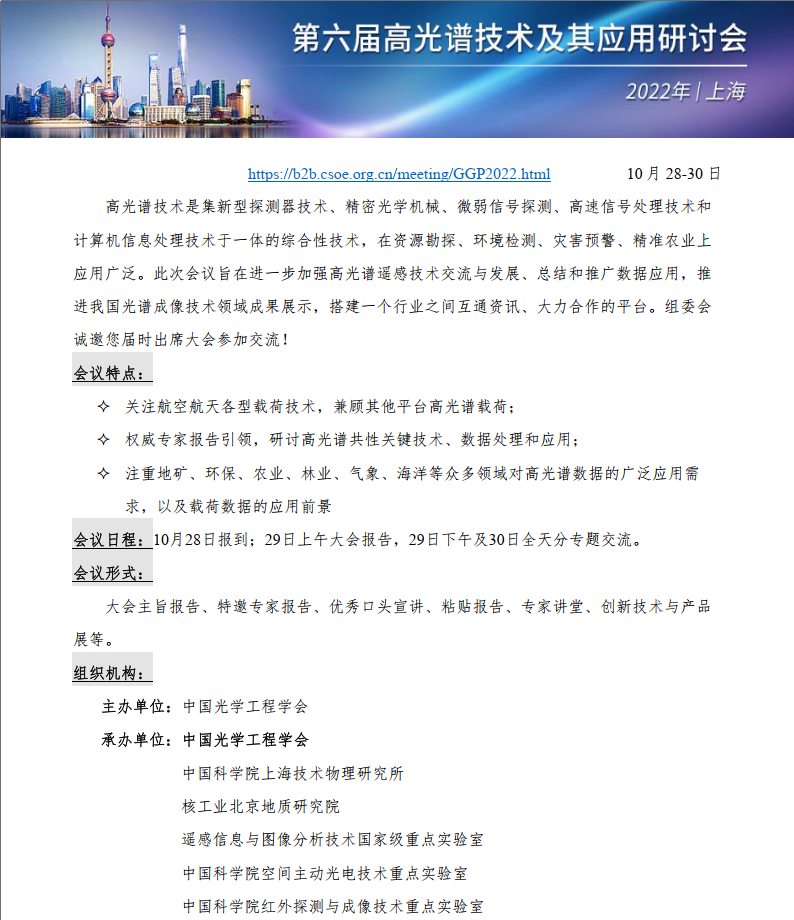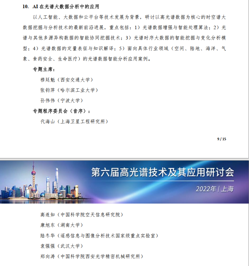 学术会议:第六届高光谱技术及其应用研讨会即将召开,欢迎投稿专题10:AI大数据应用(穆廷魁担任专题主席)